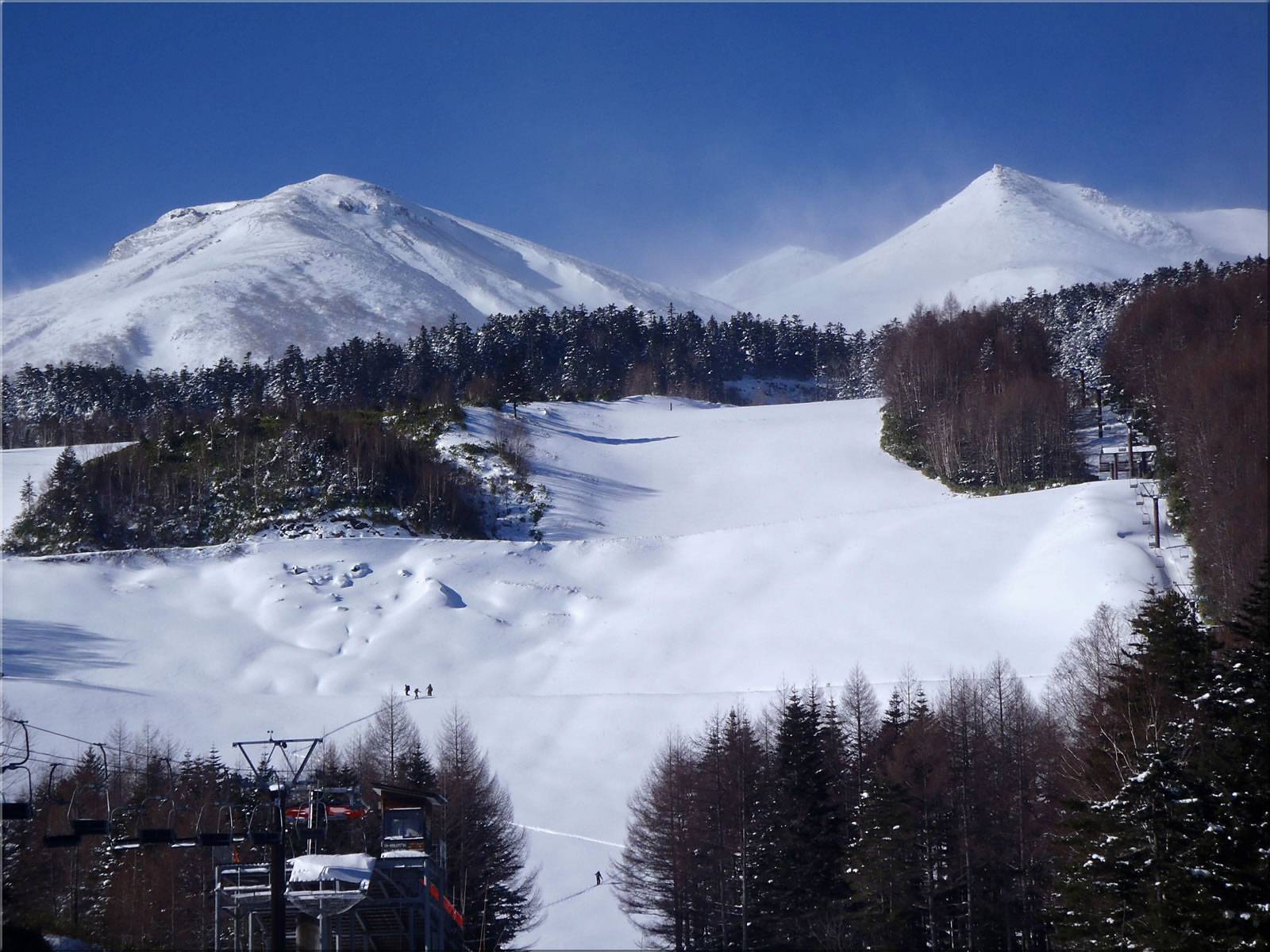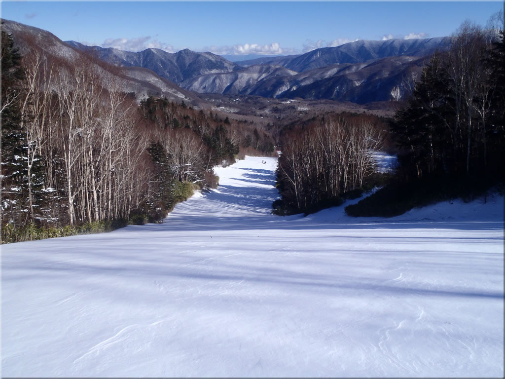 しばらく登ると正面に最上部のかもしかゲレンデと乗鞍岳が見えてきます。
