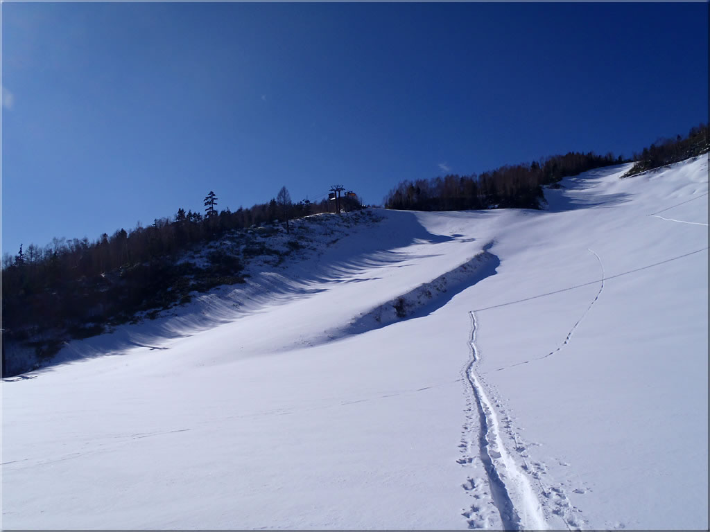 そのまま圧雪されたゲレンデだけ滑るのはもってないので、途中でこちらの斜面を滑ってみます。