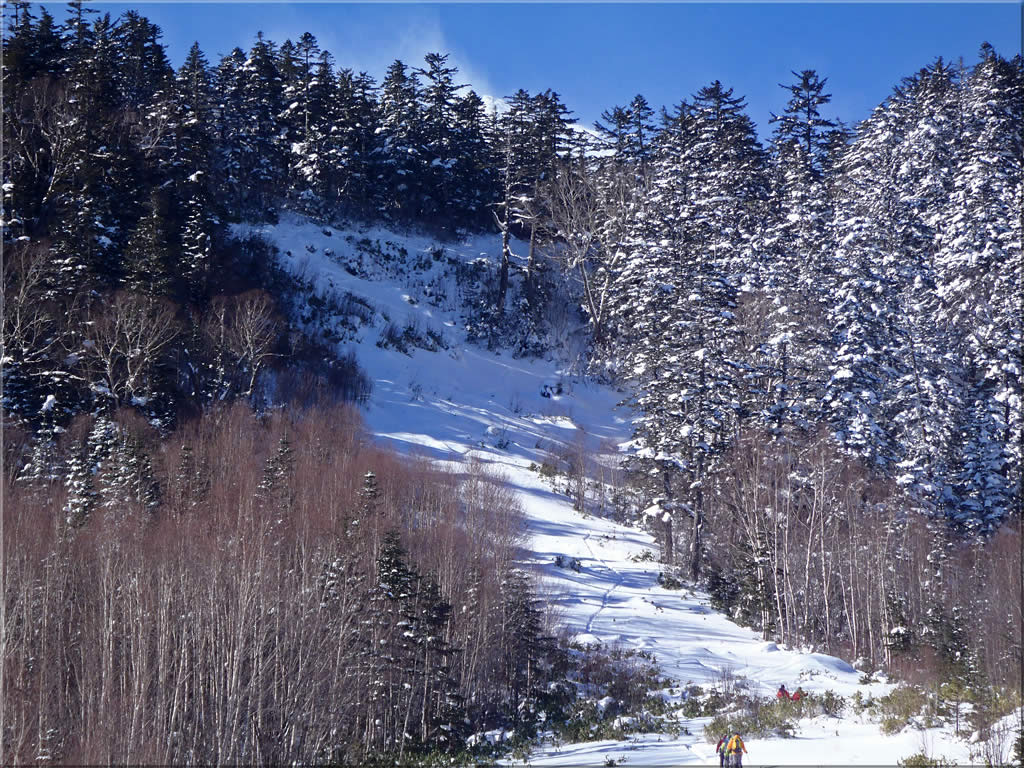 ああ気持ちよかった(^^)。ではシールを付けて登り返します。今度は上まで行かずにこちらの斜面を滑ってみることにします。少しブッシュが目立ちますがどんなものでしょうか。