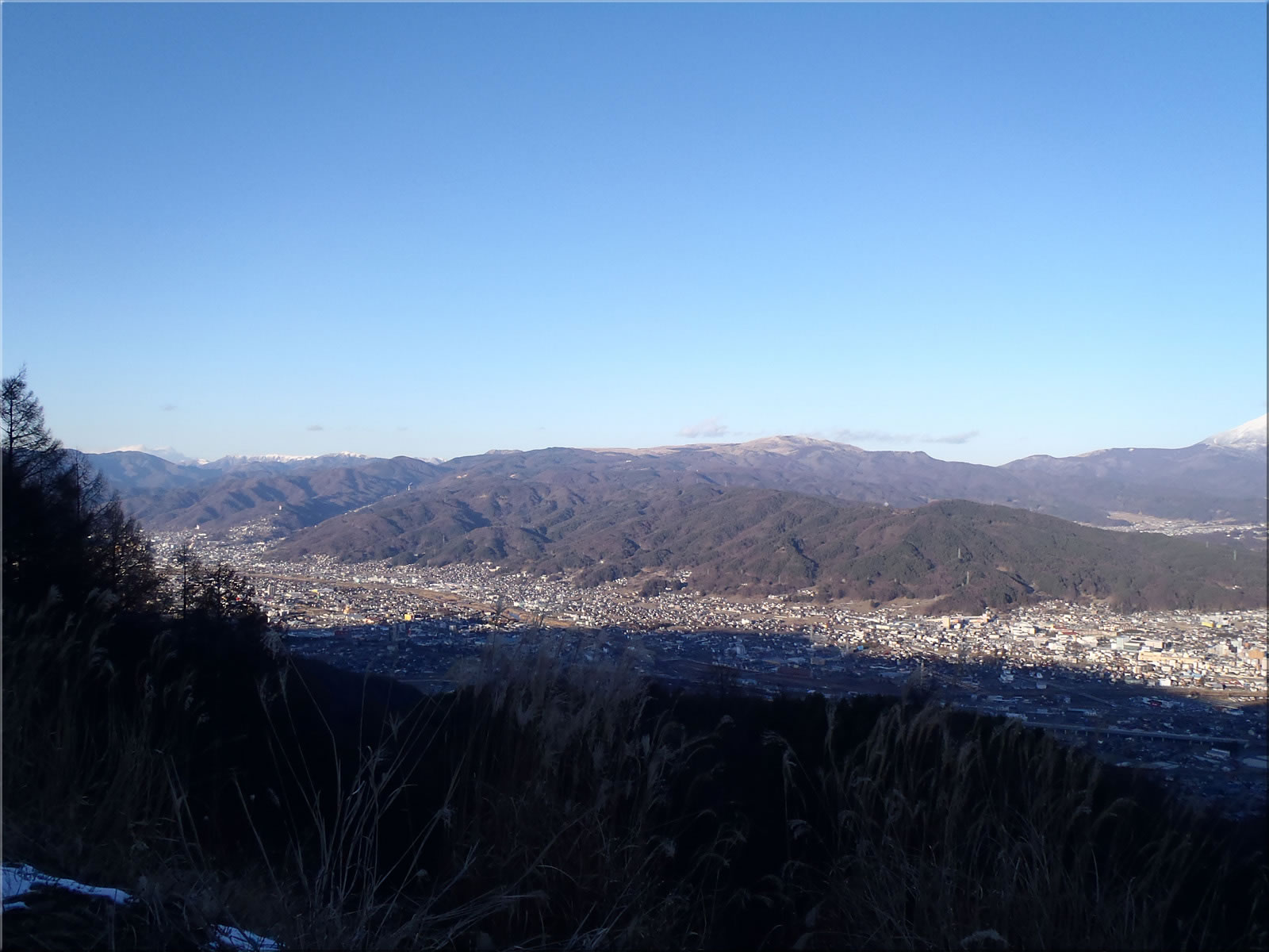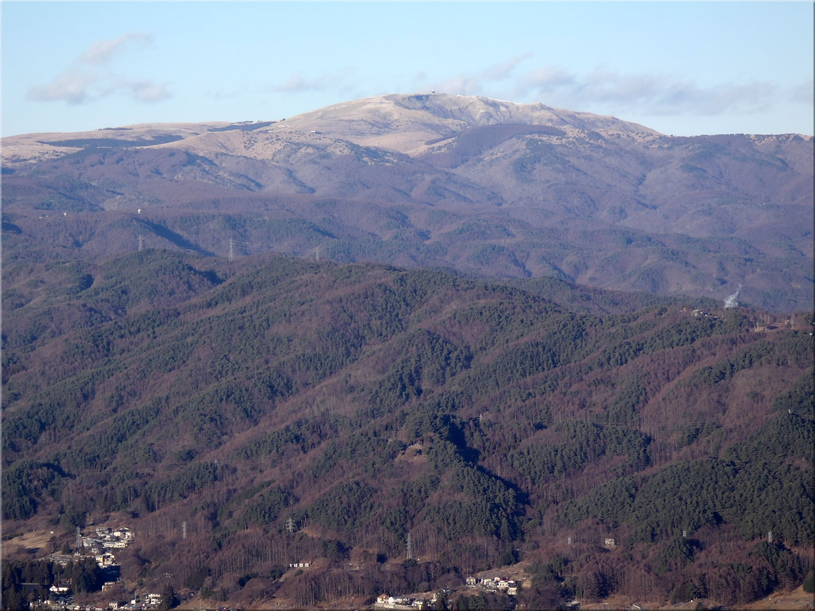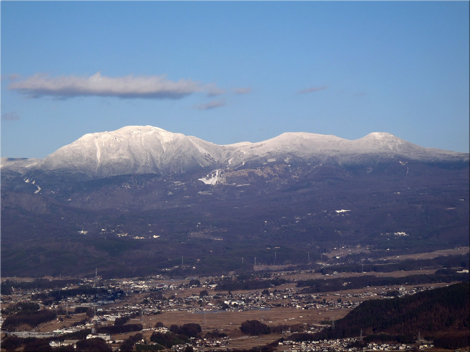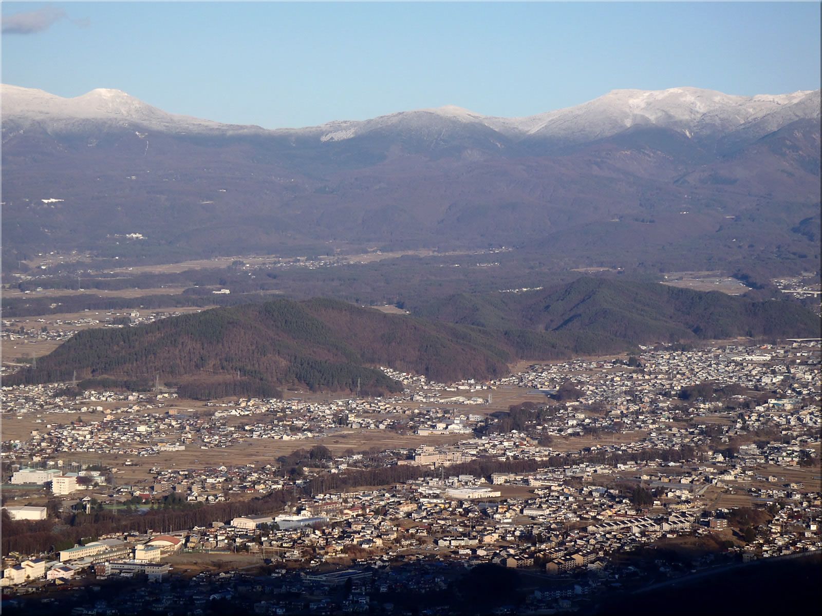 三峰山、美ヶ原をズーム。上の方は少し白くなっているのが見えます。