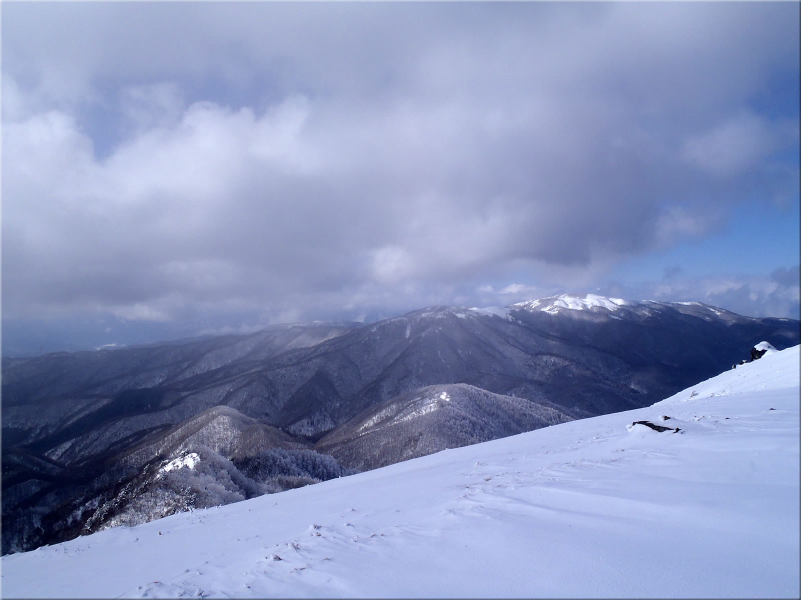 そして今登ってきた斜面。八ヶ岳も手前の雲が邪魔してよく見えません。