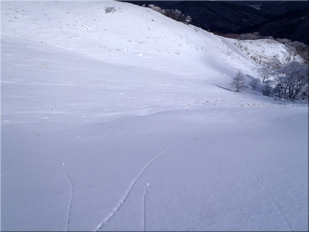 雪が下まで柔らかなため、滑り始めると板が下の笹に突っ込んでしまい、まともに滑ることが出来ません。ということでひたすら下りラッセルで直滑降です(^^;。ファットな板ならこの状況でも滑ることが出来るのだろうか。
