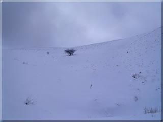 これから滑る斜面の様子。これだけ雪があればなんとか滑ることが出来るでしょうと、この斜面を滑り降りてみることにします。