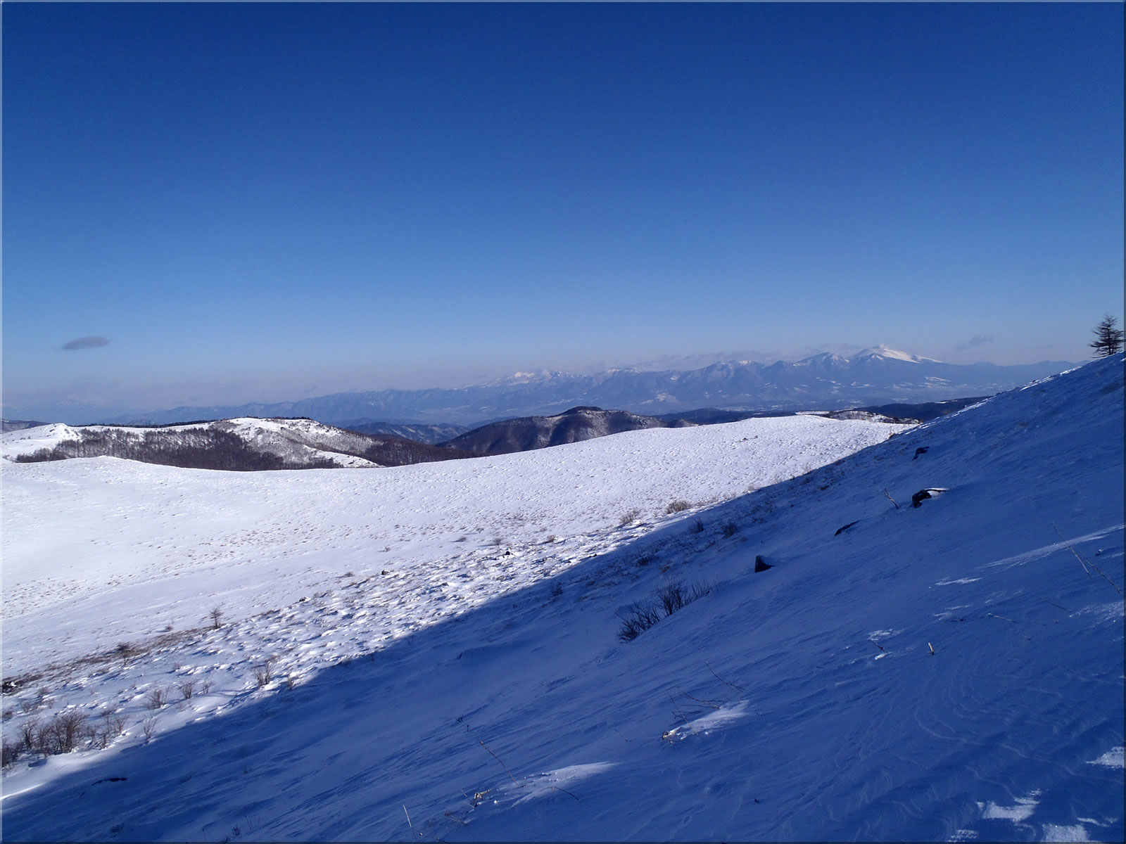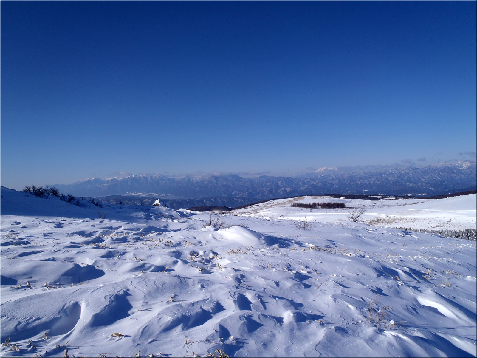 鷲ヶ峰とその向こうの北アルプス燕岳方面をズーム。鷲ヶ峰もそろそろ滑ることが出来るほど雪が積もっただろうか。