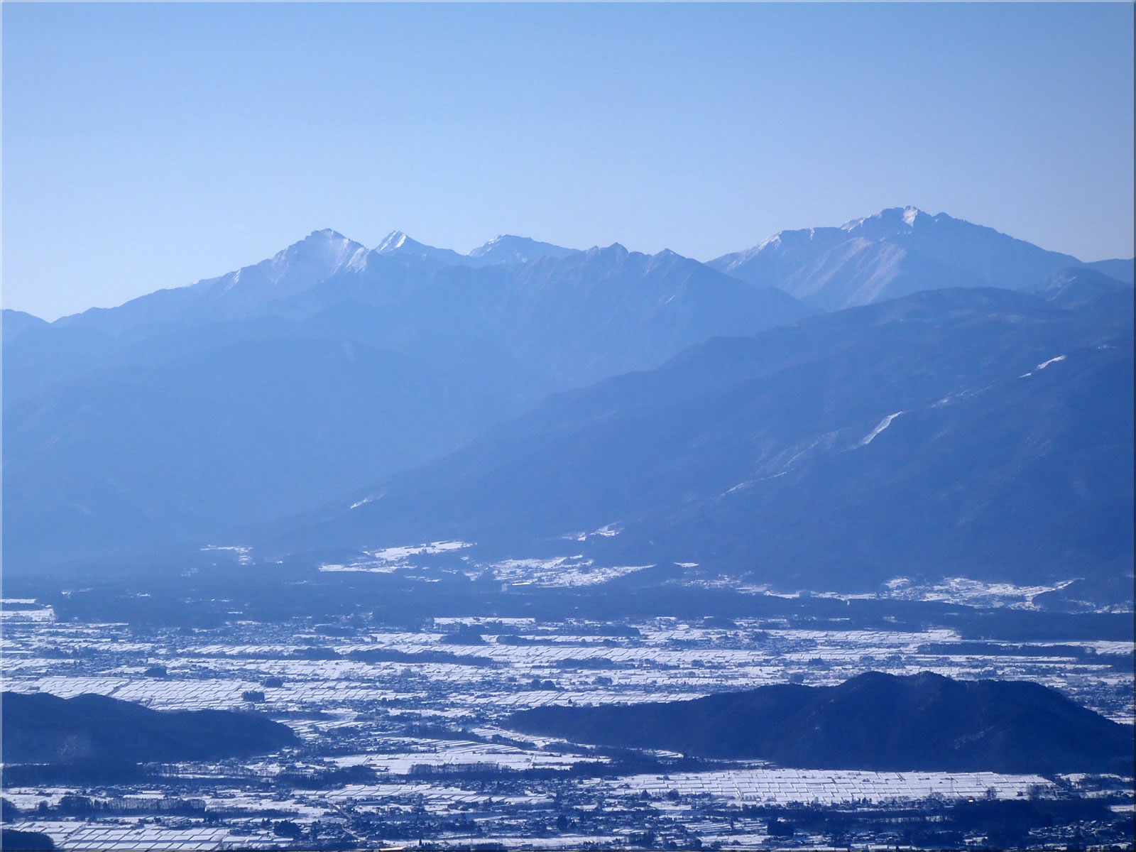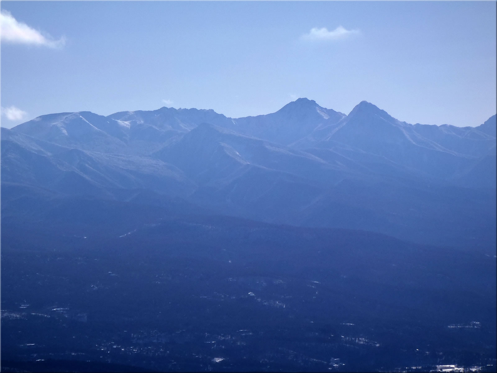 北アルプス槍穂高、常念岳方面をズーム。穂高のあたりにちょうど雲がかかってなかなか取れませんでした。