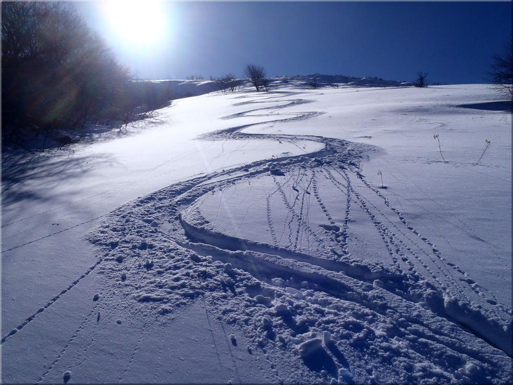 途中から山頂直登ルートに進みます。なお途中で雪が薄いところはスキーでも踏み抜きましたし、また急斜面の一部では雪庇が崩れた跡がありましたので、初めての人はこちらのルートはお勧め出来ません。スノーシューなら登山道をそのまま登った方が楽でかつ展望も楽しめると思います。