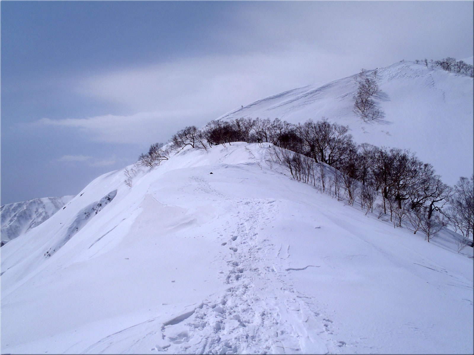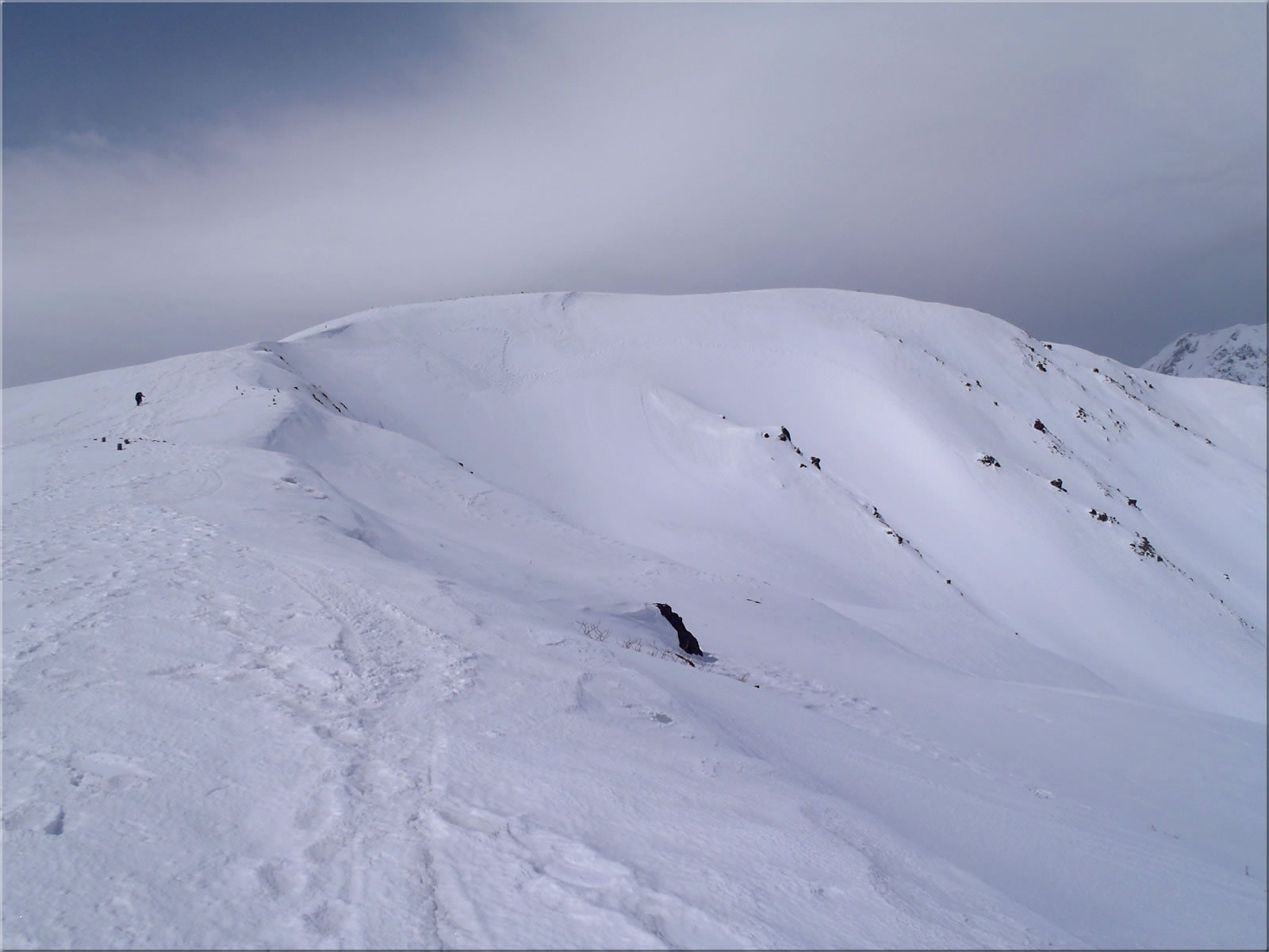 さて今日はどの斜面を滑ろうかと、斜面の様子を見ながら進んでいきます。写真では穏やかそうに見えますが、稜線上は吹き飛ばされそうな強い風が吹き荒れていました。
