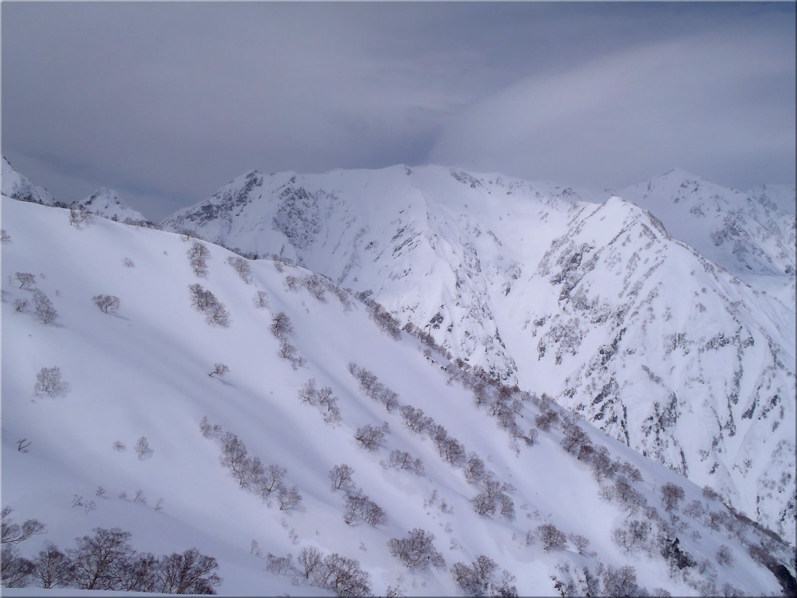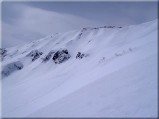 八方沢上部の南面斜面をズーム。当初は北面の無名沢上部を滑ってみる予定でしたが、上部の風があまりに強いのと寒いのとで、風下側である南面の方にドロップしました。