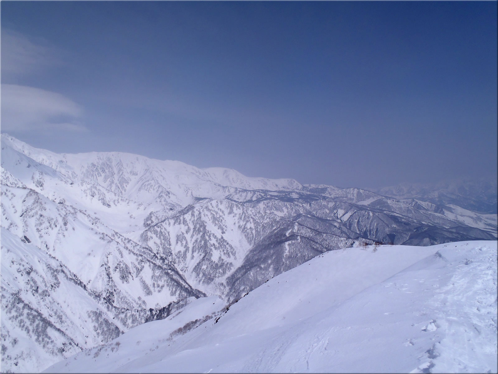 高気圧に覆われて快晴が期待できたこの日、展望とまさかのパウダーを楽しみに今シーズン2回目となる八方尾根にバックカントリー(テレマークスキー)に出かけてきました。ただ残念ながら山には少し雲がかかり、遠くもかすんであまり展望はありませんでした。おまけに稜線上は強い風が常に吹いていて、かなり寒かったです。稜線上はかりかりで、ああ今日は斜面も強風パックで駄目かもと諦めていたのですが、斜面には意外にも柔らかめの雪が吹きだまっていました(^^)。