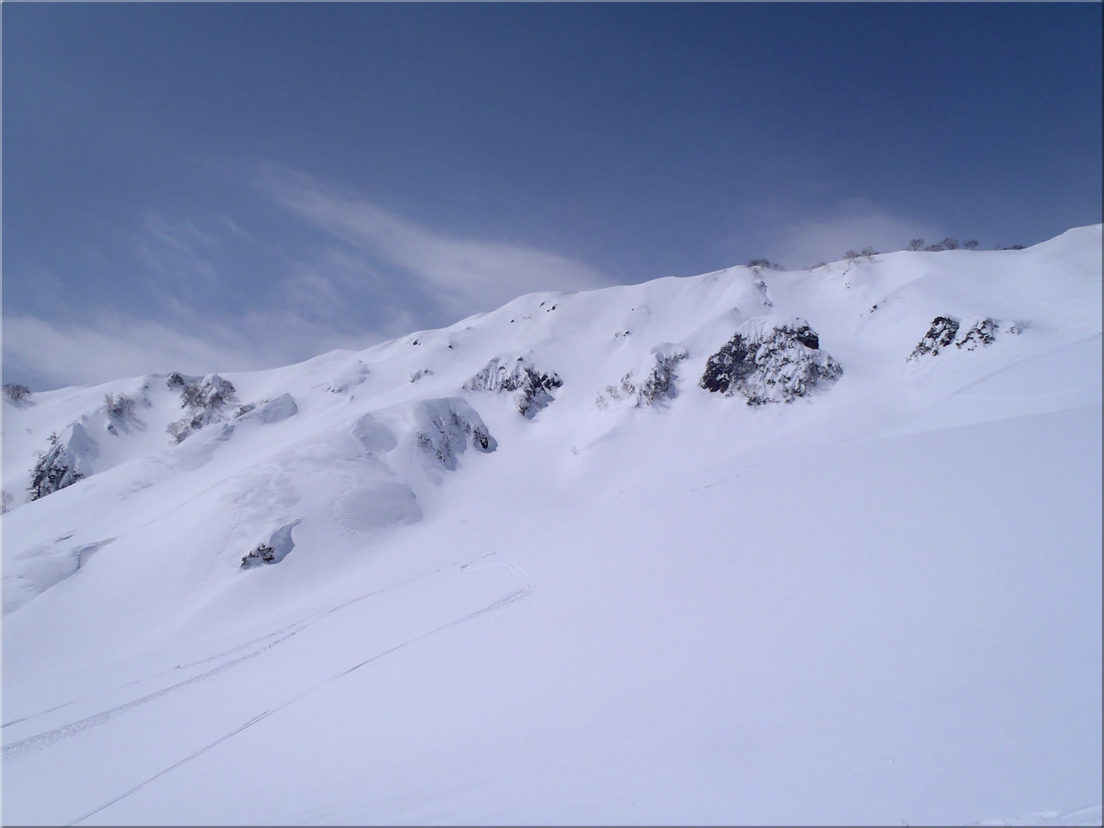兎平ですが、強風が吹き荒れた跡がはっきりと見て取れます。ああ、やはりゲレンデにはパウダーは無さそうです。