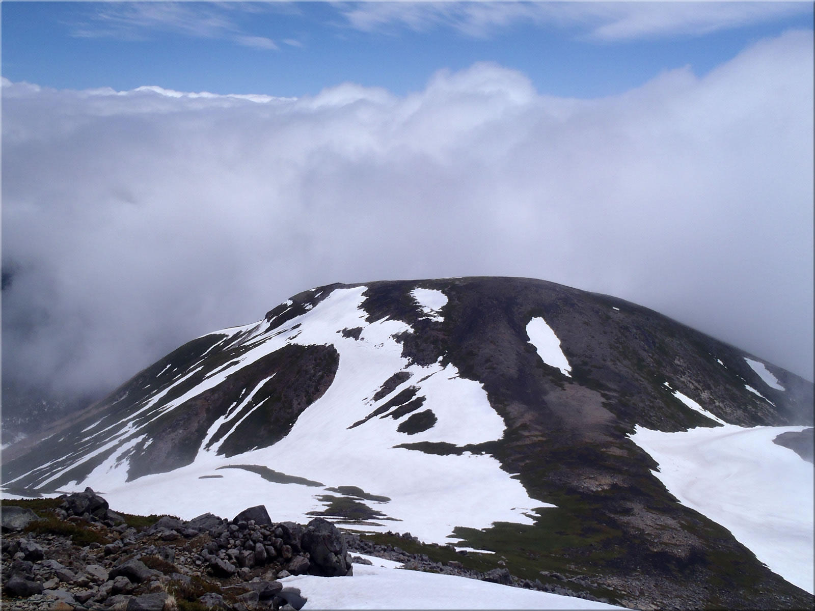 今登ってきた斜面。もしかしたら来たアルプスも見えてくるのではとも期待したのですが、私が山頂にいる間はこれが精一杯でした。