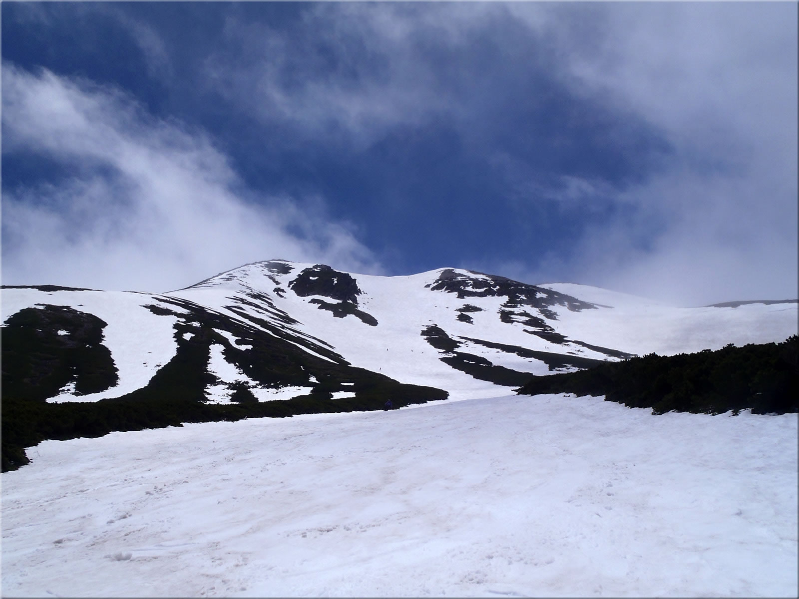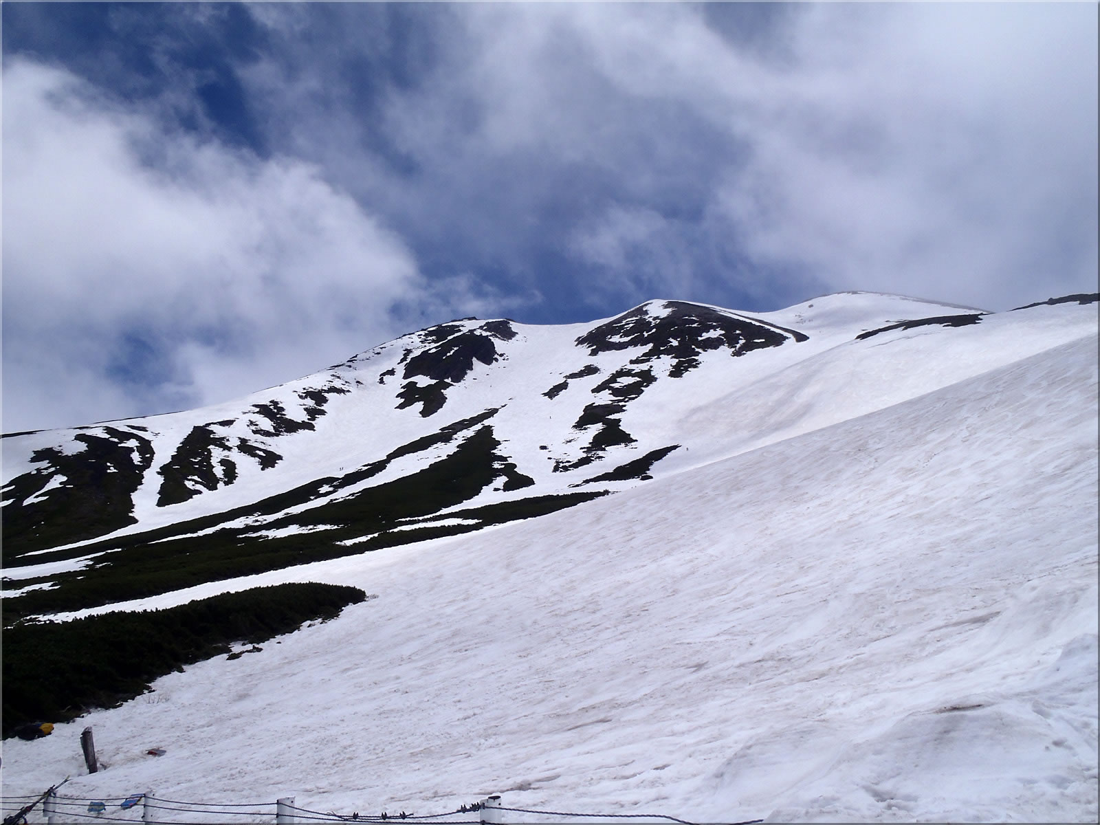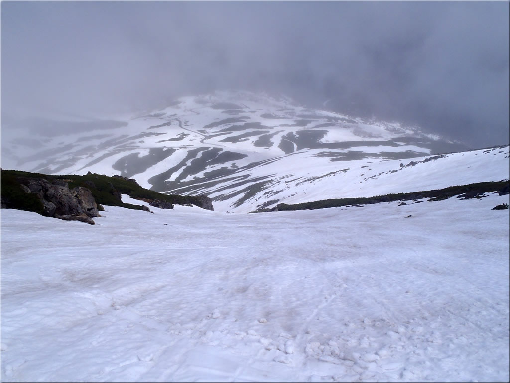長野県は前日に梅雨入りして大雨でしたが、この日は梅雨の晴れ間でまあまあの天気が期待出来たことから、今シーズン最後の乗鞍にバックカントリー(テレマークスキー)に出かけて来ました。乗鞍に出かけるのは2週間ぶりとなりますが、やはり雪は徐々に減ってきていて、ハイマツで滑るルートがだんだんと制限され始めていました。それでも雪面は思った以上に状態が良く(雨による縦溝もそれほど無く、まるでゲレンデの圧雪バーンのようなフラットな滑りやすいざらめでした)、最後の乗鞍を気持ちよく滑ることが出来ました。