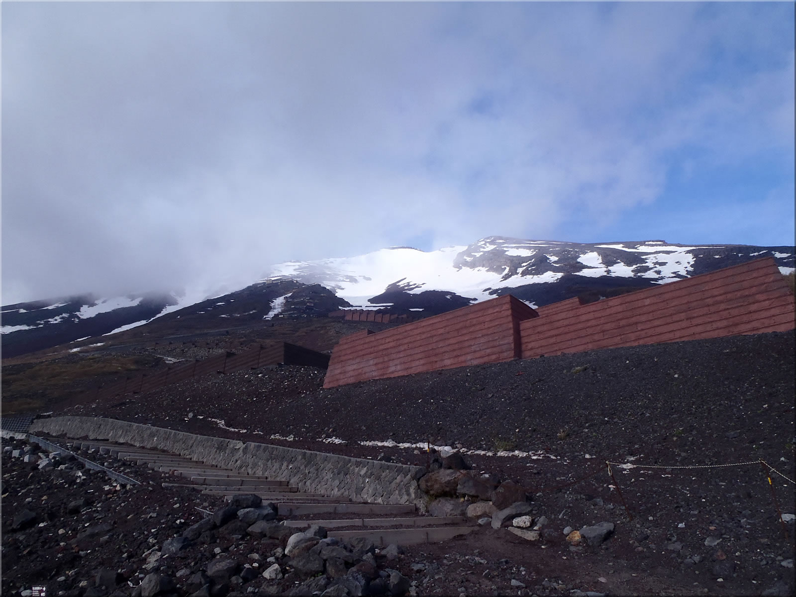 前方を見ると吉田口登山道方面にもうガスが上がってきています。うーん、こんなに早くガスが上がってきてしまうなんて。