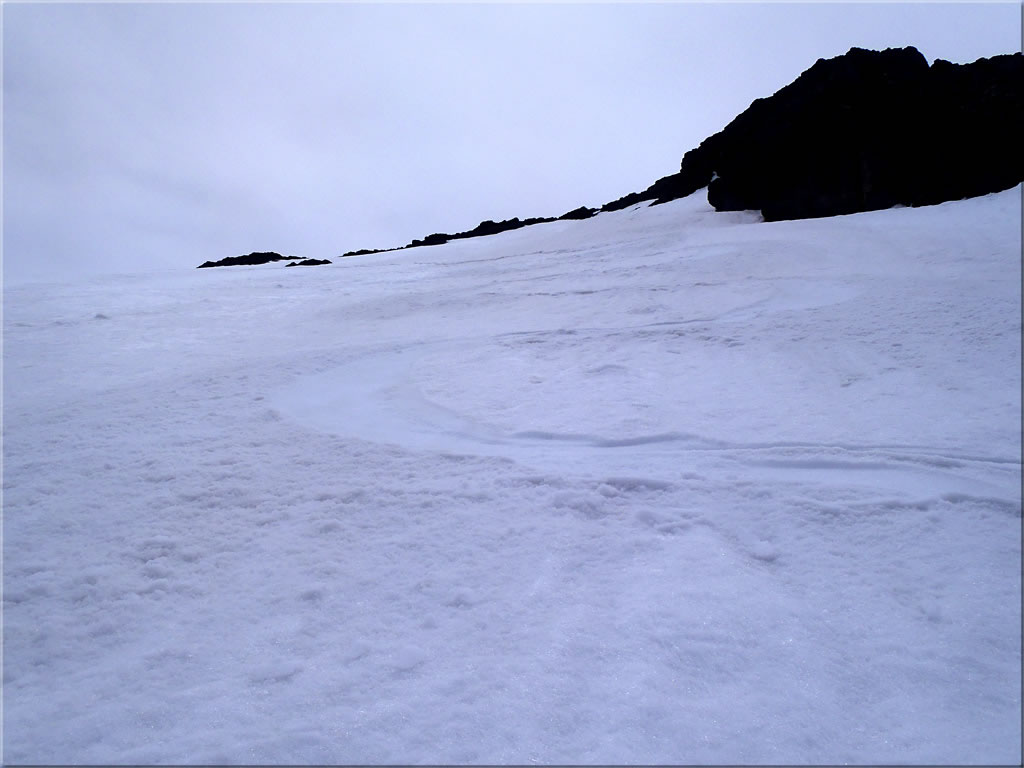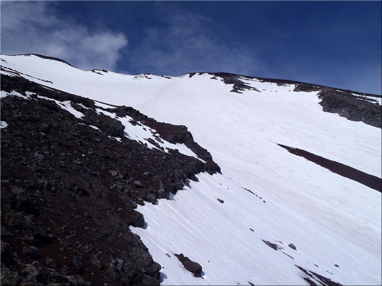 八合目の辺りで二股に分かれますが、登山道に近い右の方を滑り降りていきます。