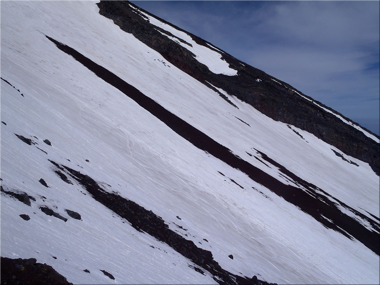途中から、雪の上の小さい石が随分と目に付くようになりました。ゆっくり注意して滑れば避けられる程度でしたが、今後は雪解けとともにどんどんこの表面の石も増えて板が傷だらけになってしまうことでしょう。その意味では八合目から下の雪渓はそろそろ賞味期限切れという感じです。