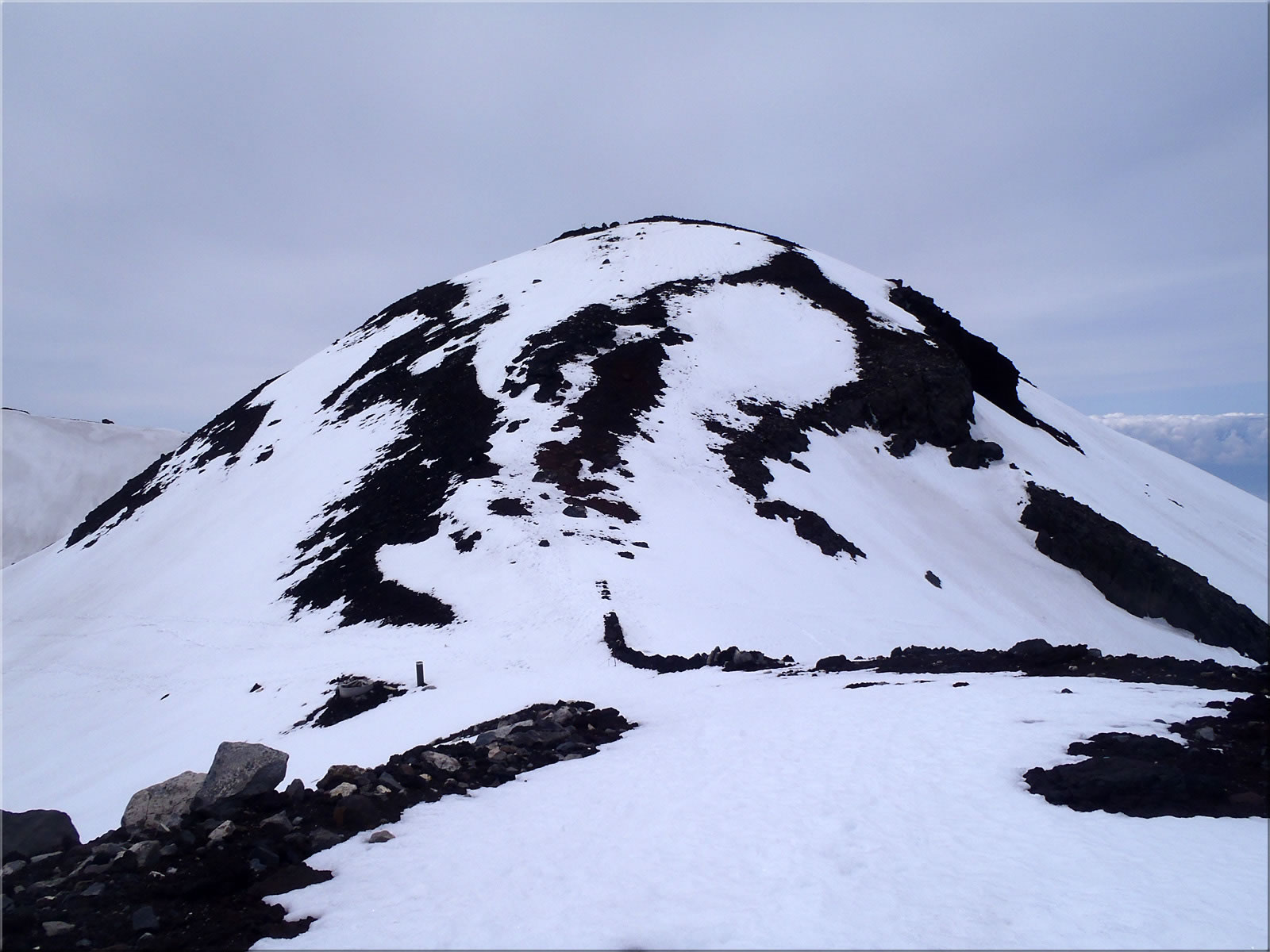 この辺りでだいたいガスの上に出たようです。日射しが強く風が全くありませんので、上着・手袋なし、夏用の帽子でも暑いくらいでした。そして風が弱い状態は山頂まで変わらず、結局手袋も上着も着ることなく、そのまま山頂まで行ってしまいました。