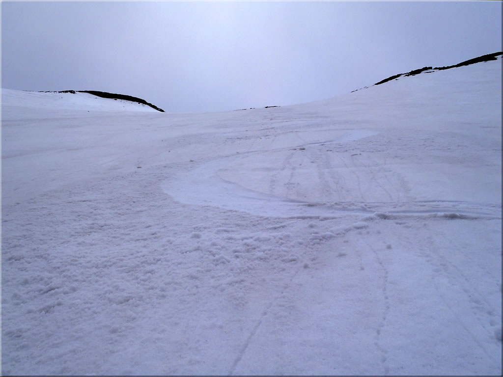 今週末からは本格的な梅雨到来の予報と言うことで、ぜひその前の晴れた日に今シーズンの滑り納めとして富士山に出かけたいと思い、晴れマークの出ていたこの日、今シーズン2回目となる吉田大沢に滑りに出かけてきました。前線の雲がそろそろかかり始めていたものの、午前中は時々薄雲がかかる程度でまあまあの良い天気でした。このまま滑る時まで持ってくれればと思っていたのですが、残念ながら滑る頃になると空一面に薄雲が広がってしまい、久々に滑る時に青空無しのバックカントリーとなってしまいましたが(^^;、でも1週間前に来た時と違って山頂から全斜面が快適ざらめとなっていて、七合目まで本当に気持ちよく滑り降りることが出来ました。