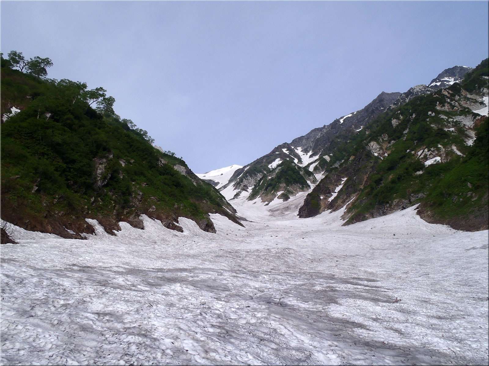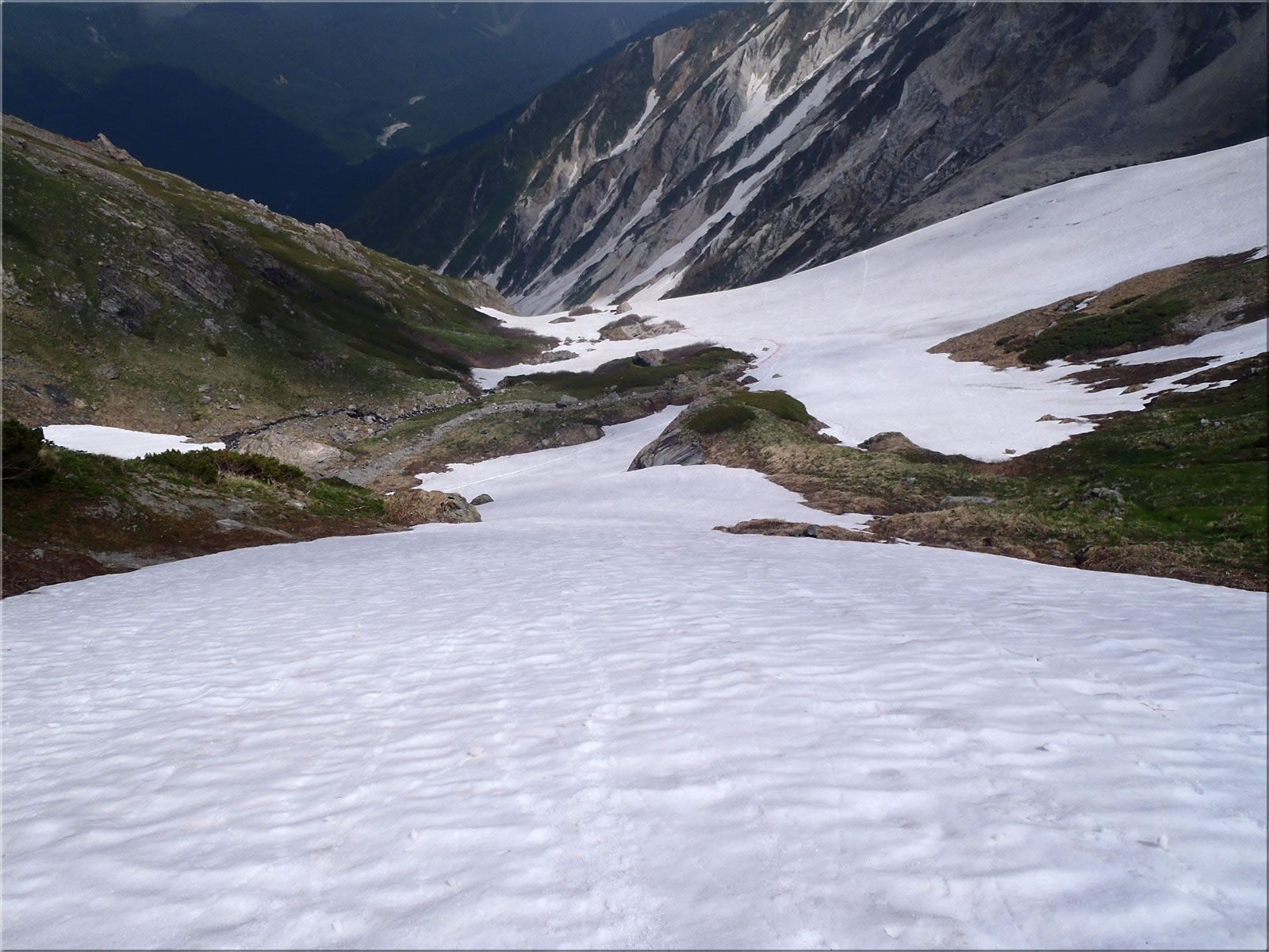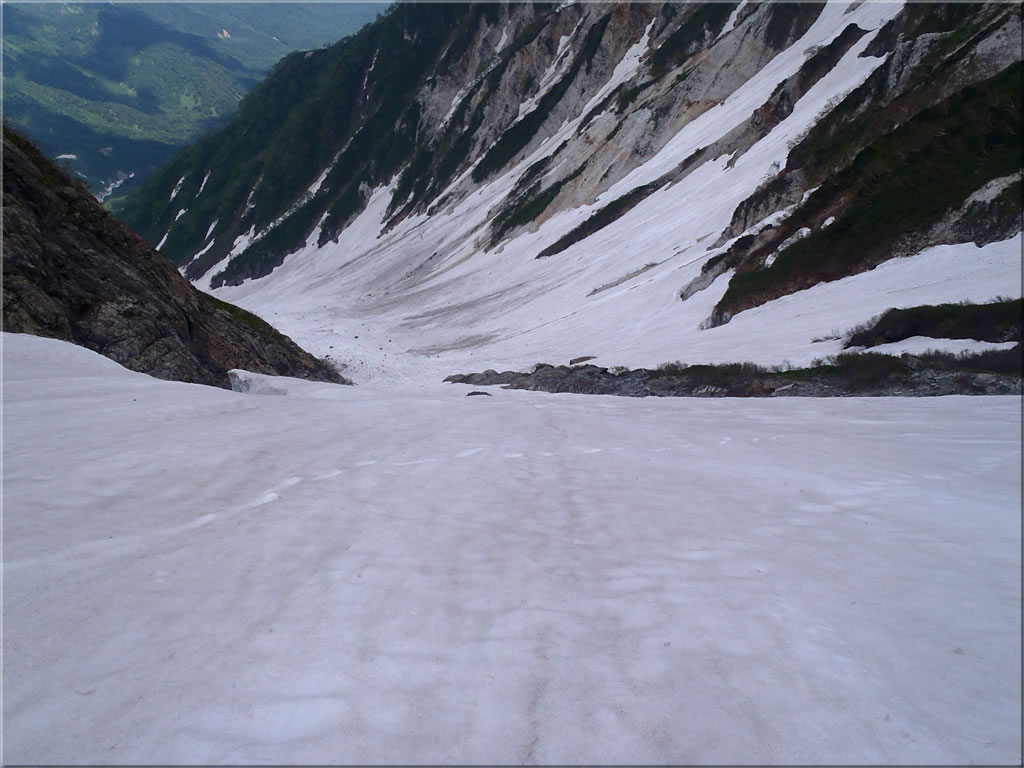 大雪渓ですが、石が多いために滑るのは諦め、歩いて下っていきます。それにしても歩くのもいやになるほど雪渓が長く、ここは滑り降りれないと来た価値が半減するなあと感じました。