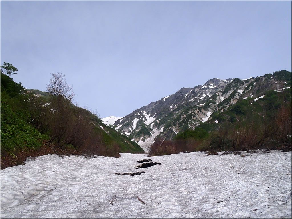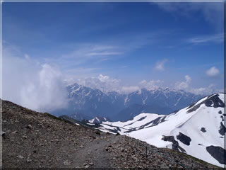 頂上宿舎手前の雪渓ごしに杓子岳、白馬鑓方面を見ています。ただ山頂は残念ながらガス。なお今見えている雪渓はすぐ下でいったん切れてしまいます。