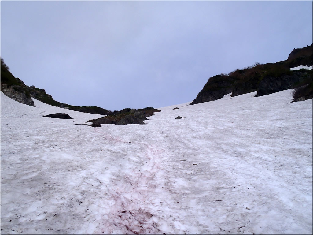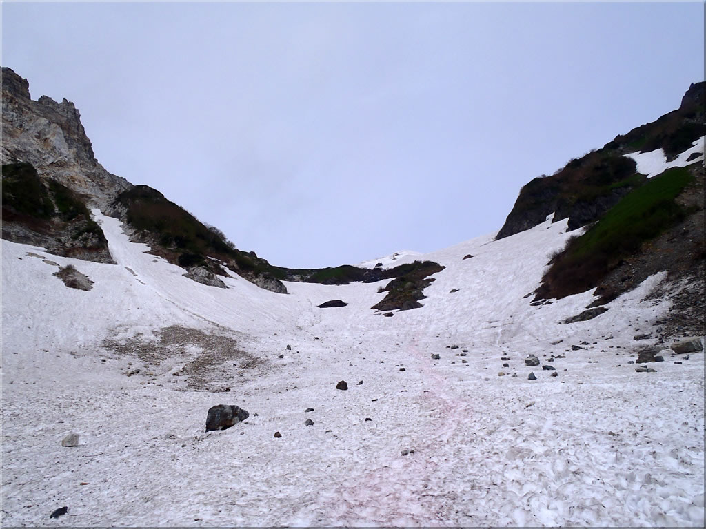 ルートに赤い紅がらがうっすらと引いてありますので、それをたどって登っていきます。最初は雪渓上に大きな石はそれほど目に付かなかったのですが、間もなく大きな石が雪渓上に目に付くようになります。こんな大きな石が雪渓のど真ん中まで落ちてくるとすると、ガスって周りが見えない時にこの雪渓を通過するのは出来るだけ避けたいものだと感じます。