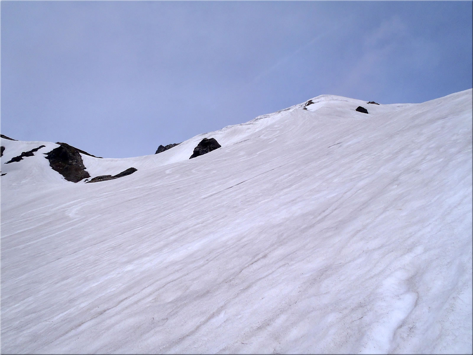 ただこの急斜面の中間あたりまで滑り降りた時、ターンの際にいきなりエッジが外れてそのまま20mほどざーっと滑落(^^;。この辺りは緩んでいるのは表面1cmほどでその下は堅いクラストしたバーンで、なかなか止まらずに焦りました。最後は滑る時はいつもお守り代わりにザックに固定して付けていたアイゼンの歯で止まった気がします。