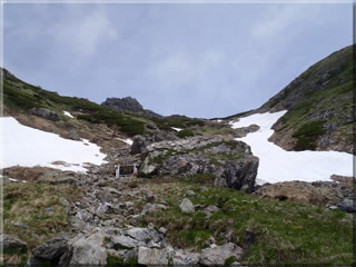 予定したルートは次の写真の左側に見える大きな岩の真下です。ただふとその先に見える斜面が、ここから見る限り思ったほど急でないように見え、それなら広い斜面の方がいいかなと迷いが生じ、結局予定した雪渓はパスしてその先まで進んでしまいました。