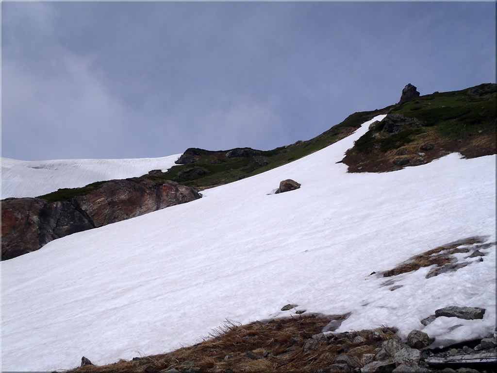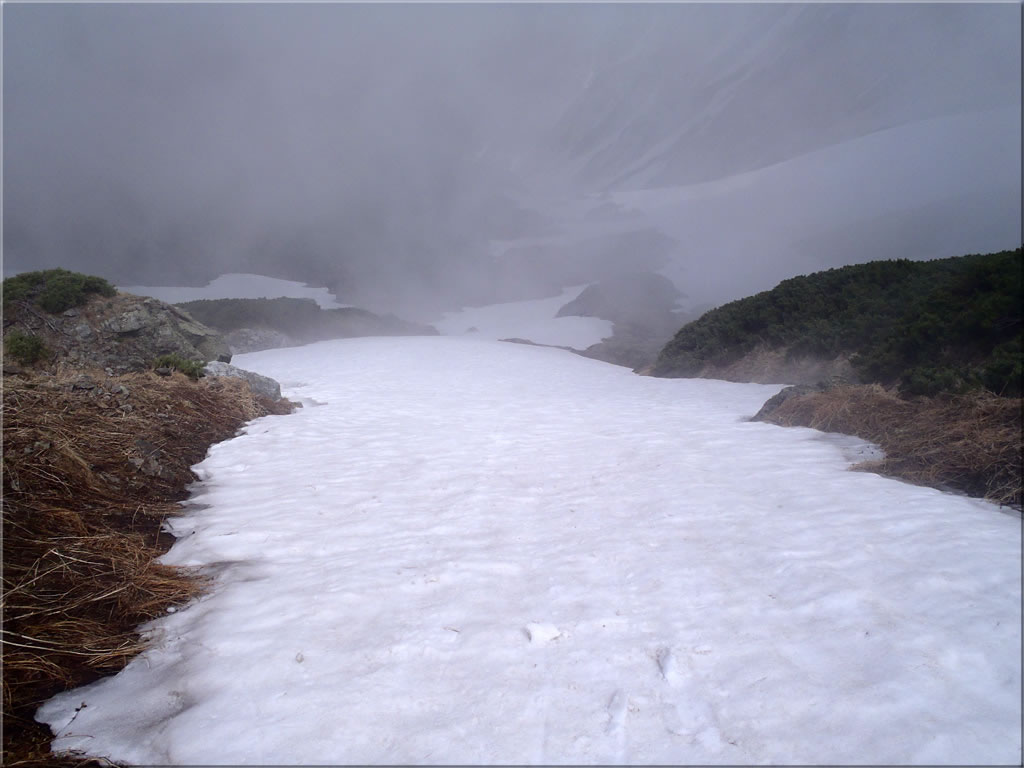 この先の登山道脇の雪渓に到着、12時45分でした。ここに着くまでは周囲はきれいに見えていたのですが、着いたとたんに濃いガスに包まれて数メートル先が見えない状態になってしまいました。この斜面の上部には亀裂や岩が見えていましたので、周囲が見えない状況で滑るのはあまりに危険です。まあ、しばらく待てばガスは晴れるでしょうと楽観視していたのですが、待てども待てども全くガスが晴れる気配は無し...。とうとう13時30分まで待っても状況が変わらないため、この下を滑るのは諦めて再び板をザックに付けて登山道を上り返したのでした。とほほ...。
