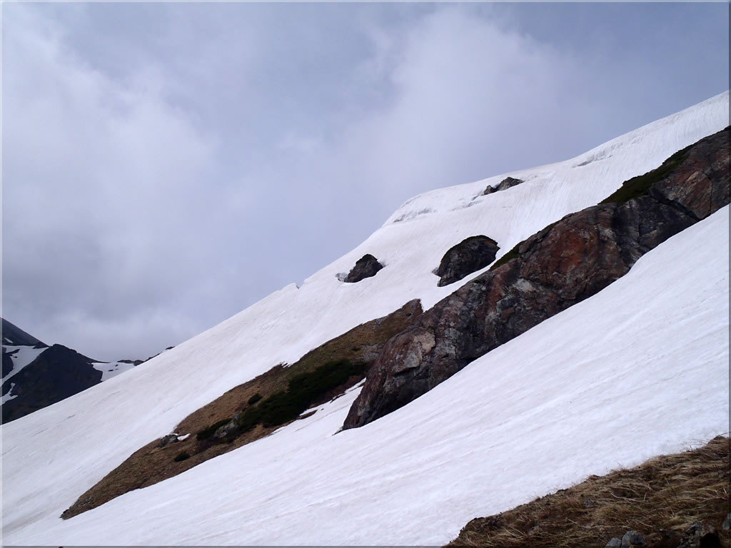 後で滑る斜面をどこにしようかと考え、すぐ左手に見える次の写真の斜面を滑ってみることにしました。登山道右側の雪渓は、途中で10mほど板を外さないと駄目なこと、左側のもう一つ向こうの斜面は上部がかなり急&亀裂で危険かなと思ったためです。実際にも予定した斜面を滑り降りましたが、その前に迷いが生じてその奥の急斜面の方を滑ろうとしてしまいました(^^;。結論的にはそちらを滑らなくて良かったです。