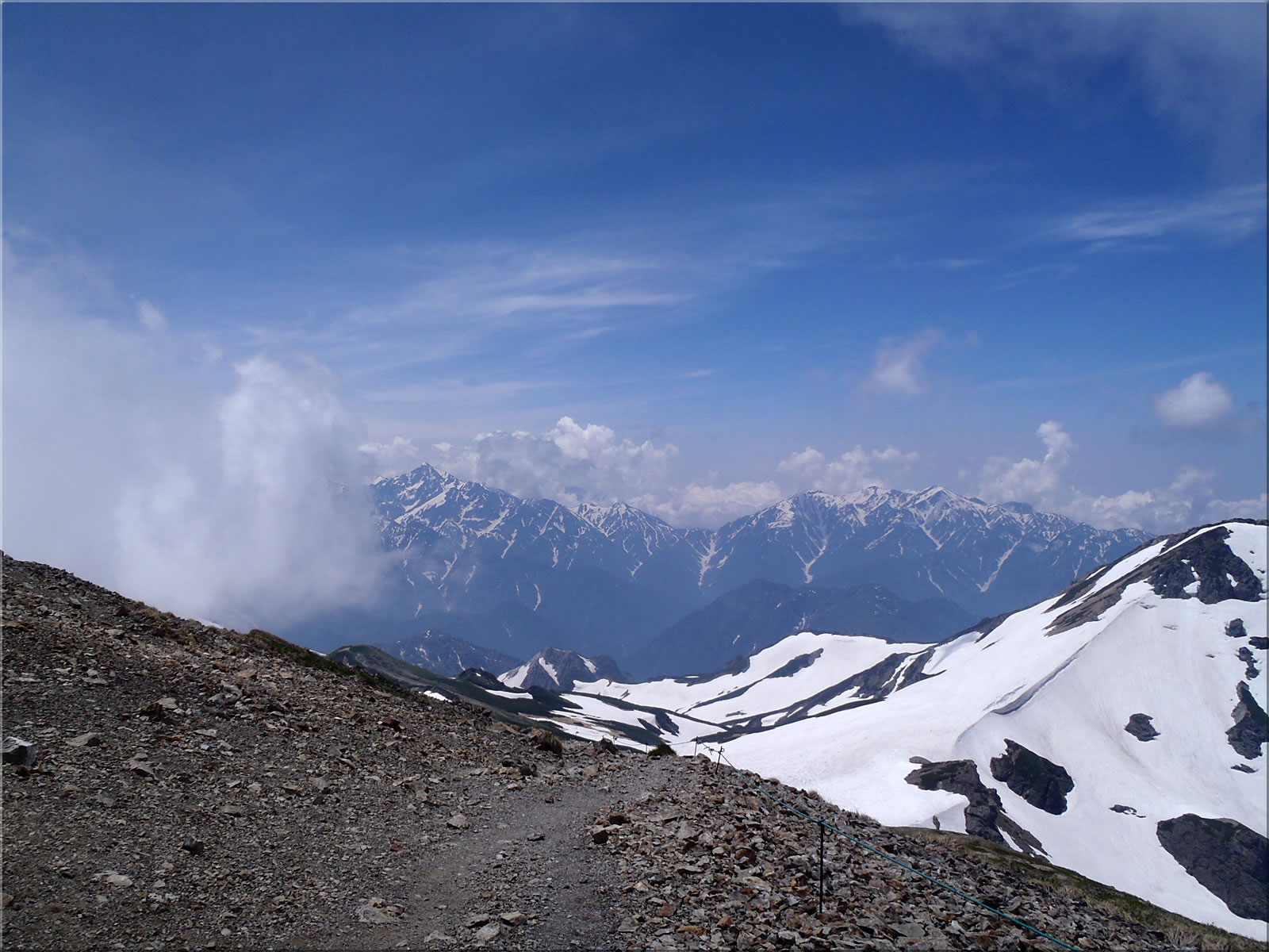 正面に朝日岳がきれいに見えています。しかも登ってくる途中では見たこともない濃い青い空です(^^)。空を見上げると、長野県側はガスで真っ白、富山側は快晴ときれいに分かれていました。