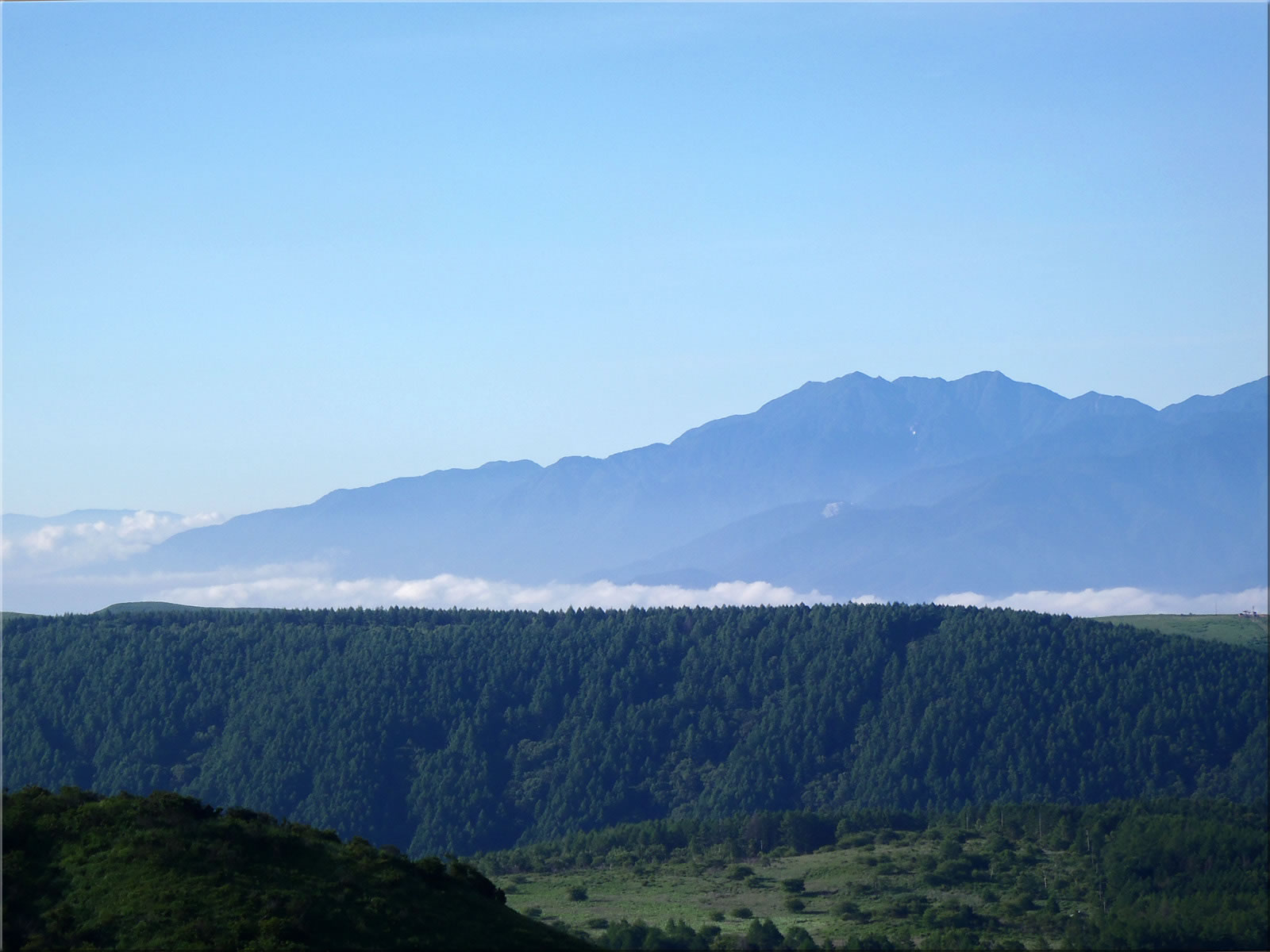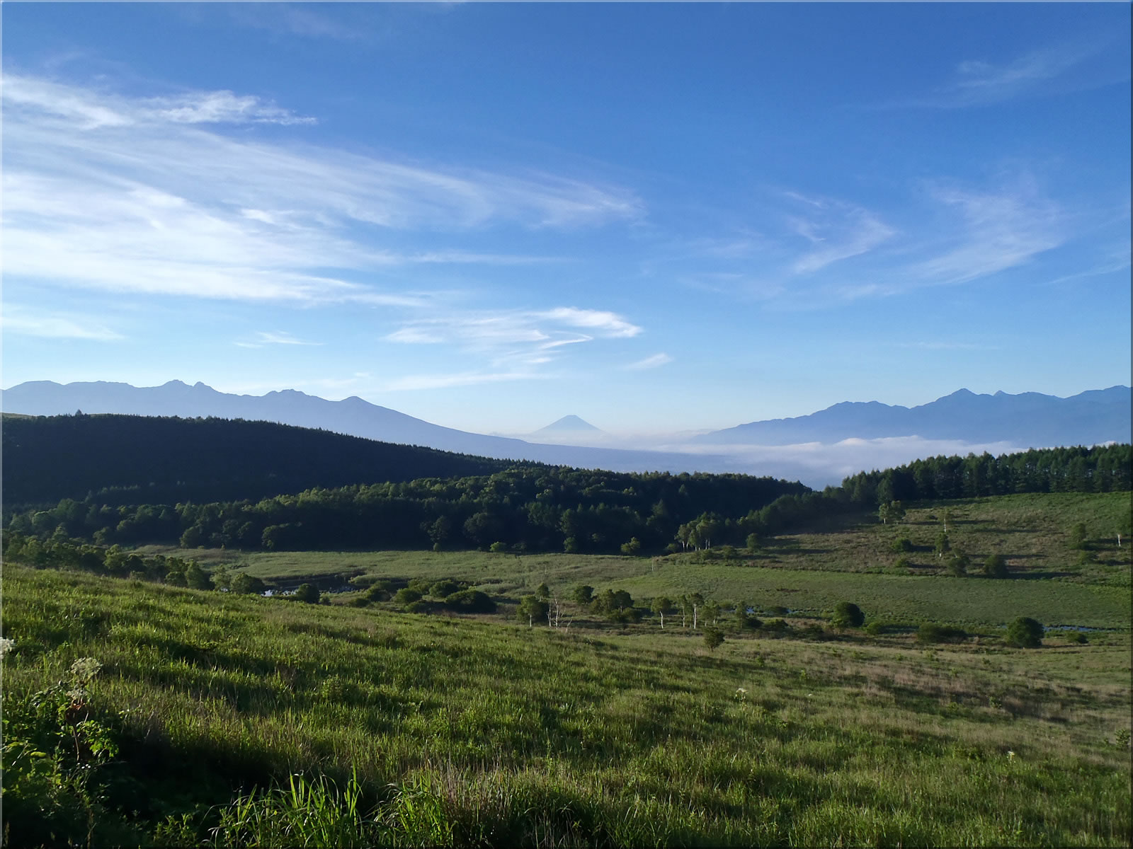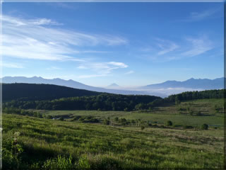 自宅を5時25分に出発し、霧ヶ峰に向かいます。次の写真は途中の展望ポイントで撮影したものです。上空には多少薄雲があって、雲一つ無い抜けるような青空でないのが少し残念ですが、でも周囲の山にはガスなどもほとんどかかっておらず、遠くまで見通せるクリアな展望が素晴らしいです(^^)。しかもこの時間は低いところには雲海が広がっていました。