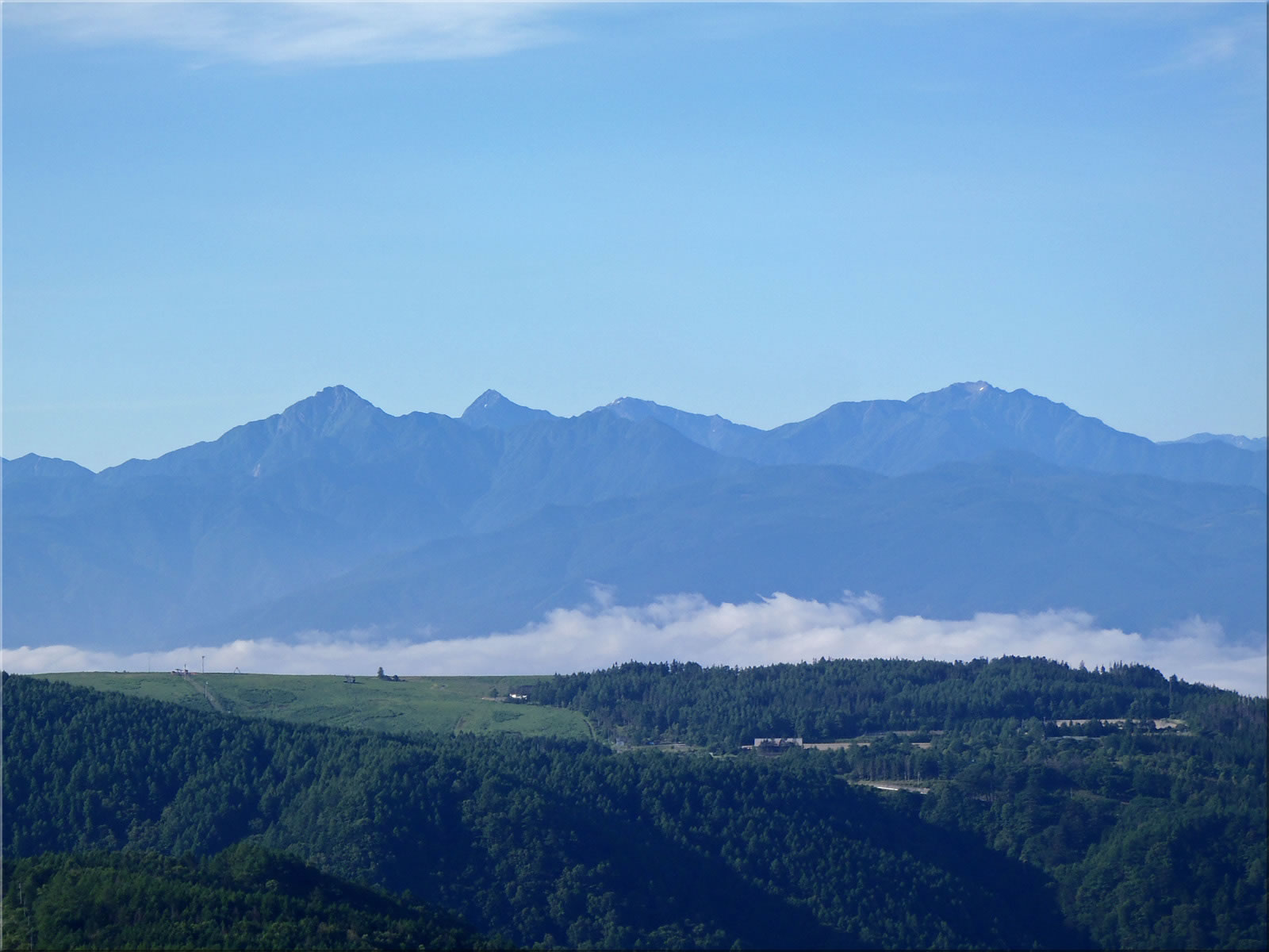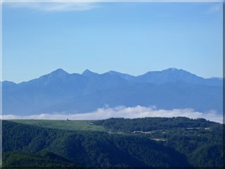 中央アルプス南部をズーム。こちらも着いた頃は一面の雲海で諏訪湖が見えませんでしたので、雲海が消えた後の写真を紹介しています。