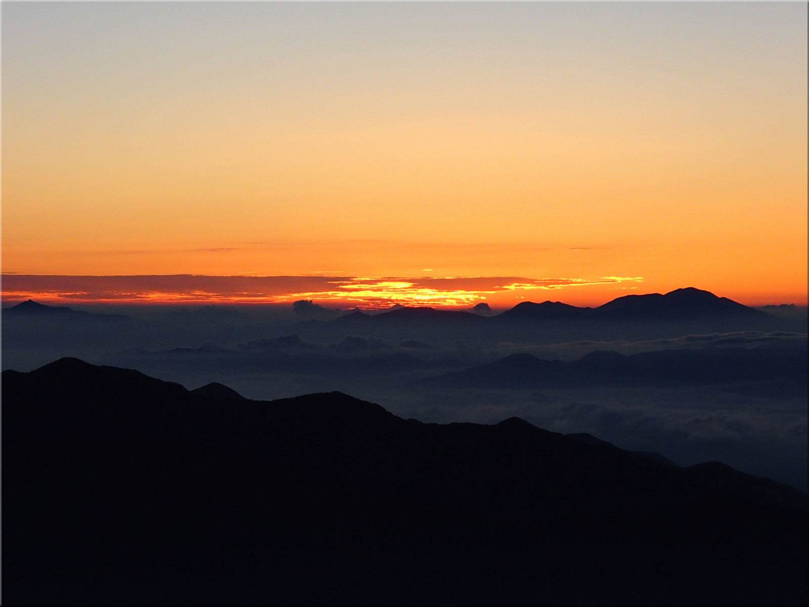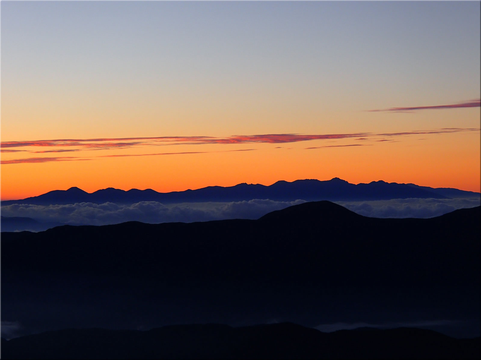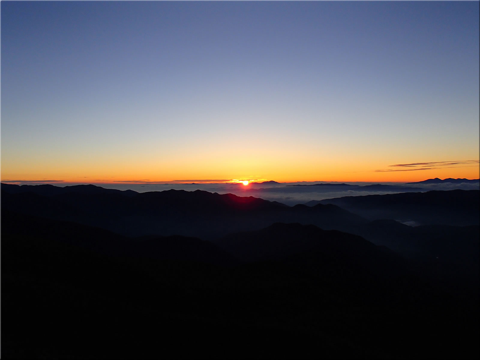 その前にまず日の出前の風景をご紹介。日の出は浅間山の少し左からのようで、そこを中心に地平線がオレンジ色に明るくなってきています。