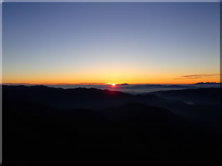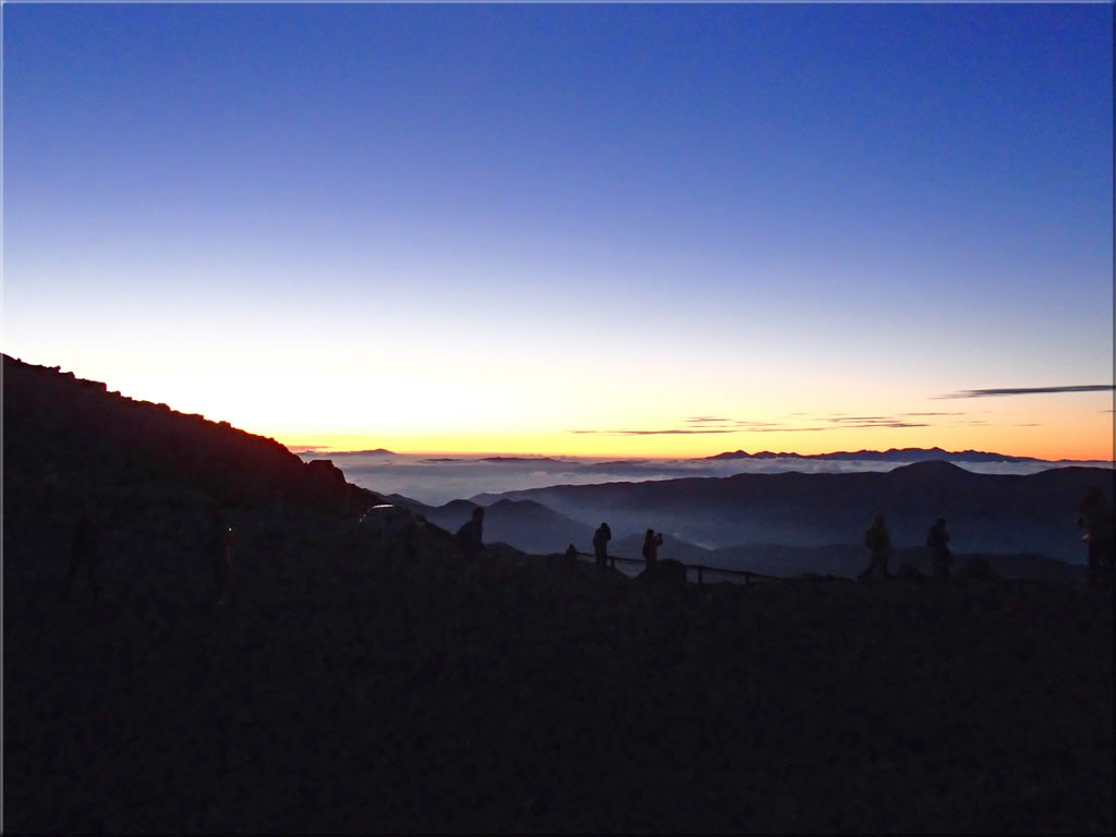 4時39分、富士見岳山頂に到着。このときはまだ数人しかいませんでしたので比較的自由に座る場所を選べましたが、その後どんどんと日の出を見る人が登ってきて、狭い山頂は人で満杯状態となりました。