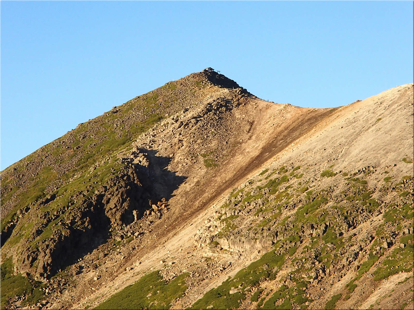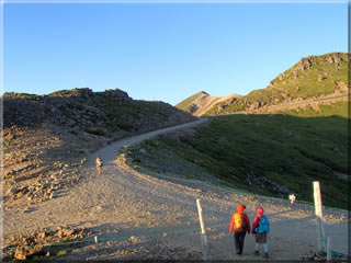 北西の少し強めの冷たい風が吹いていましたので、南東側の岩陰で風を避けながらのんびりと食事にします。ただ帰りは7時10分畳平発のシャトルバスに乗る予定ですので、あんまりのんびりとも出来ず(^^;、6時31分、そろそろ下り始めることにします。ま、30分あれば肩の小屋口のバス停まで降りれるでしょうと思っていましたが、大体予定通りで下ることが出来ました。