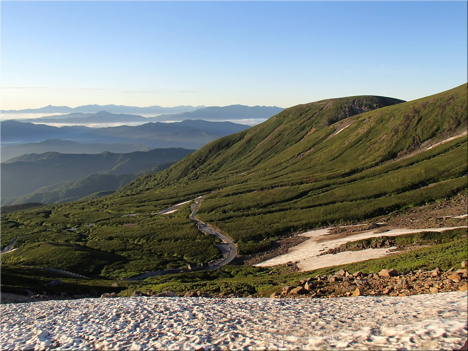 肩の小屋から肩の小屋口に下る途中に、まだ登山道が残雪で覆われている部分がありました。