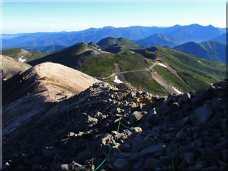 次の写真の蚕玉岳側の斜面がずいぶんとピンクに染まっているのが遠目でもわかり、何だろうとズームして撮影してみたものの遠すぎてよく分からず。もしかしてコマクサの大群落?。