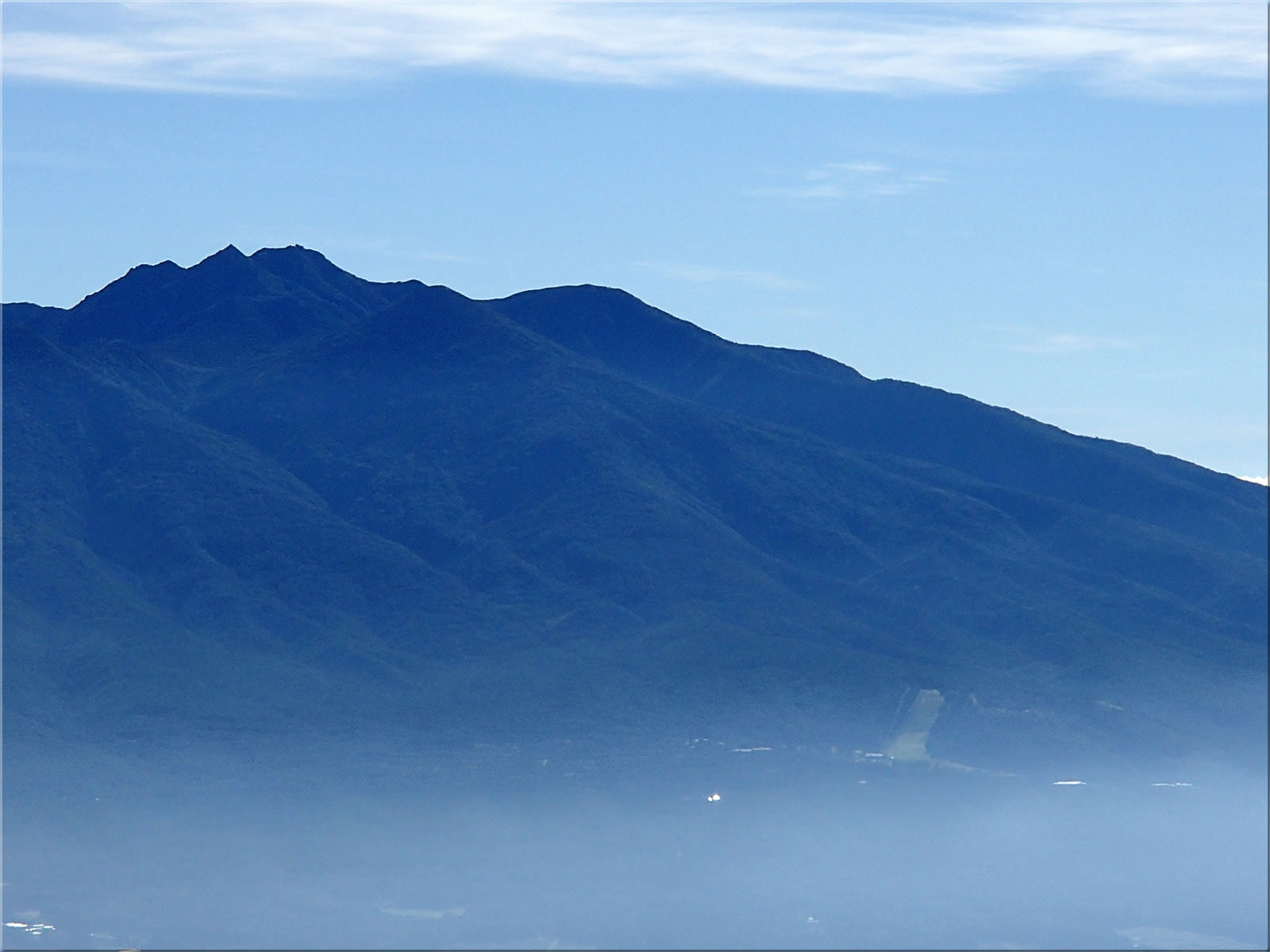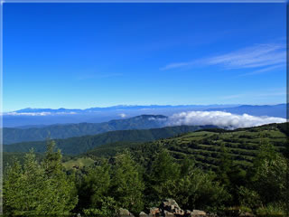 美ヶ原方面をズーム。佐久側から流れてきた雲海が鷲ヶ峰、三峰山の稜線でブロックされているようにも見えます。出発前に八島湿原のライブカメラを確認したら湿原側がガスっていたのですが、こういう訳だったのですね。