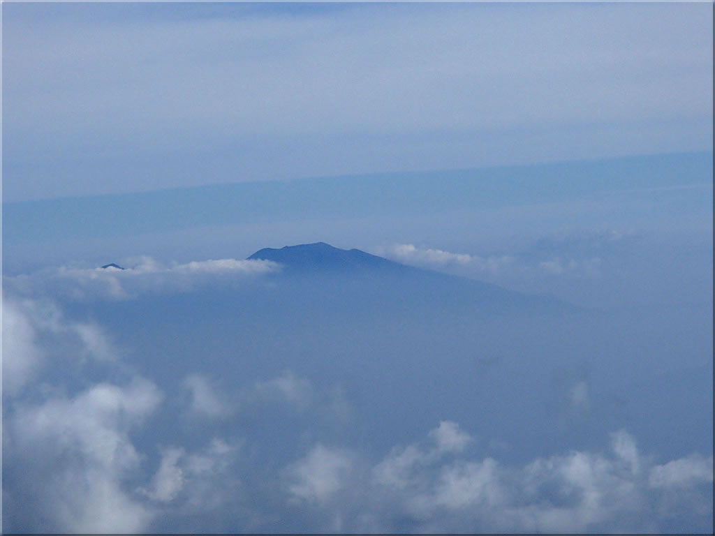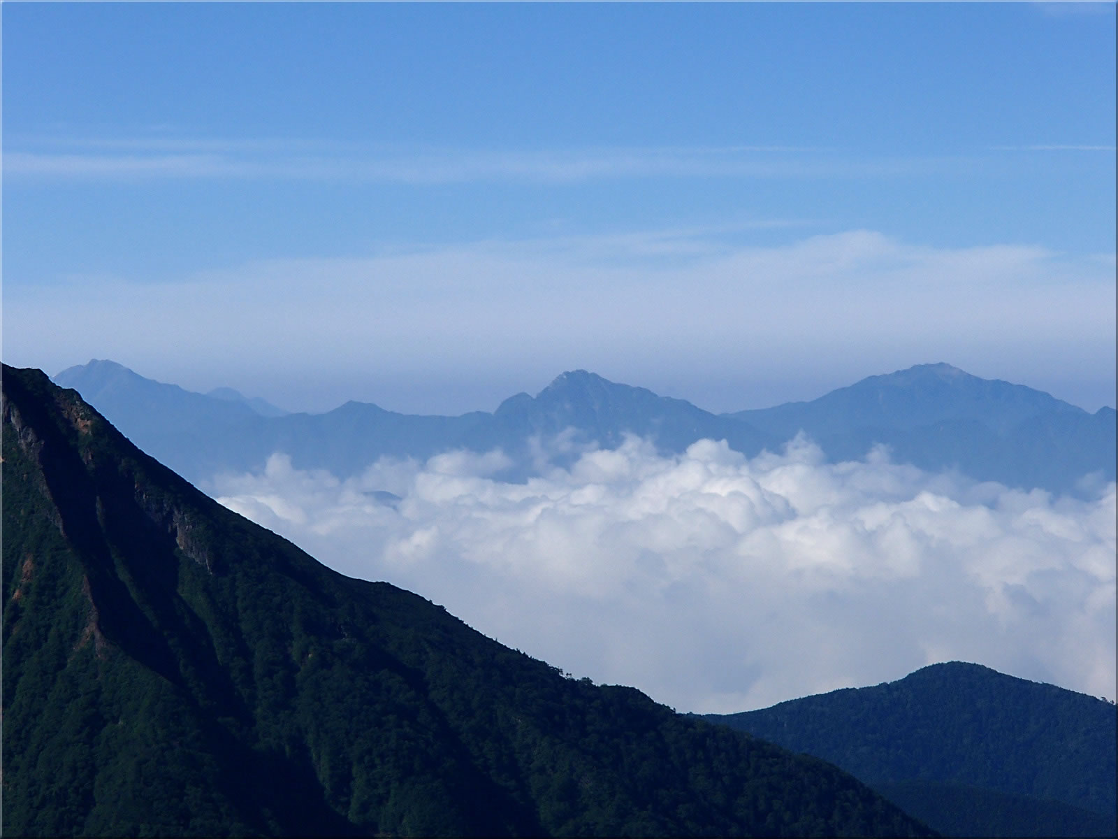 北アルプス槍穂高方面をズーム。ちなみに手前の雲は霧ヶ峰辺りにかかっているもののようで、北アルプス自身にはこの時間はほとんどガスはかかっていないように見えます。なお北アルプスは北端の白馬岳方面まで皆ピークが見えていましたが、かすみ気味でクリアな写真が撮れませんでした。