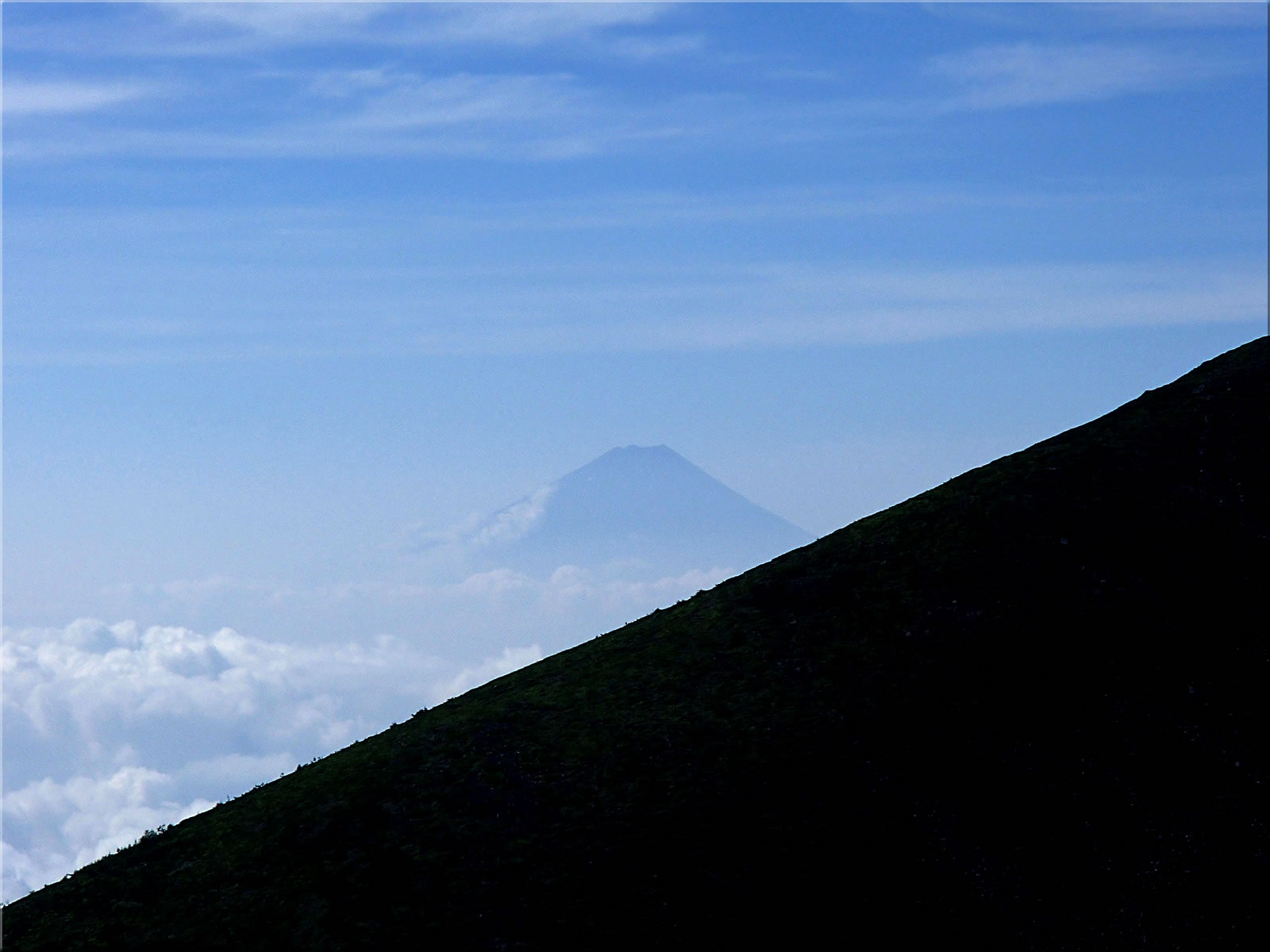 富士山をズーム。ちなみに八ヶ岳主稜線で富士山が見えるのはここまでで、ここより北側では蓼科山まで含め、横岳、赤岳などが邪魔して見ることが出来ません。ただし北八にある「にゅう」というピークはかなり東側にありますので、富士山を見ることの出来る格好の展望ポイントとなっています。北八散策の際には、天気が良ければぜひ「にゅう」にも立ち寄って見て下さい(^^)。