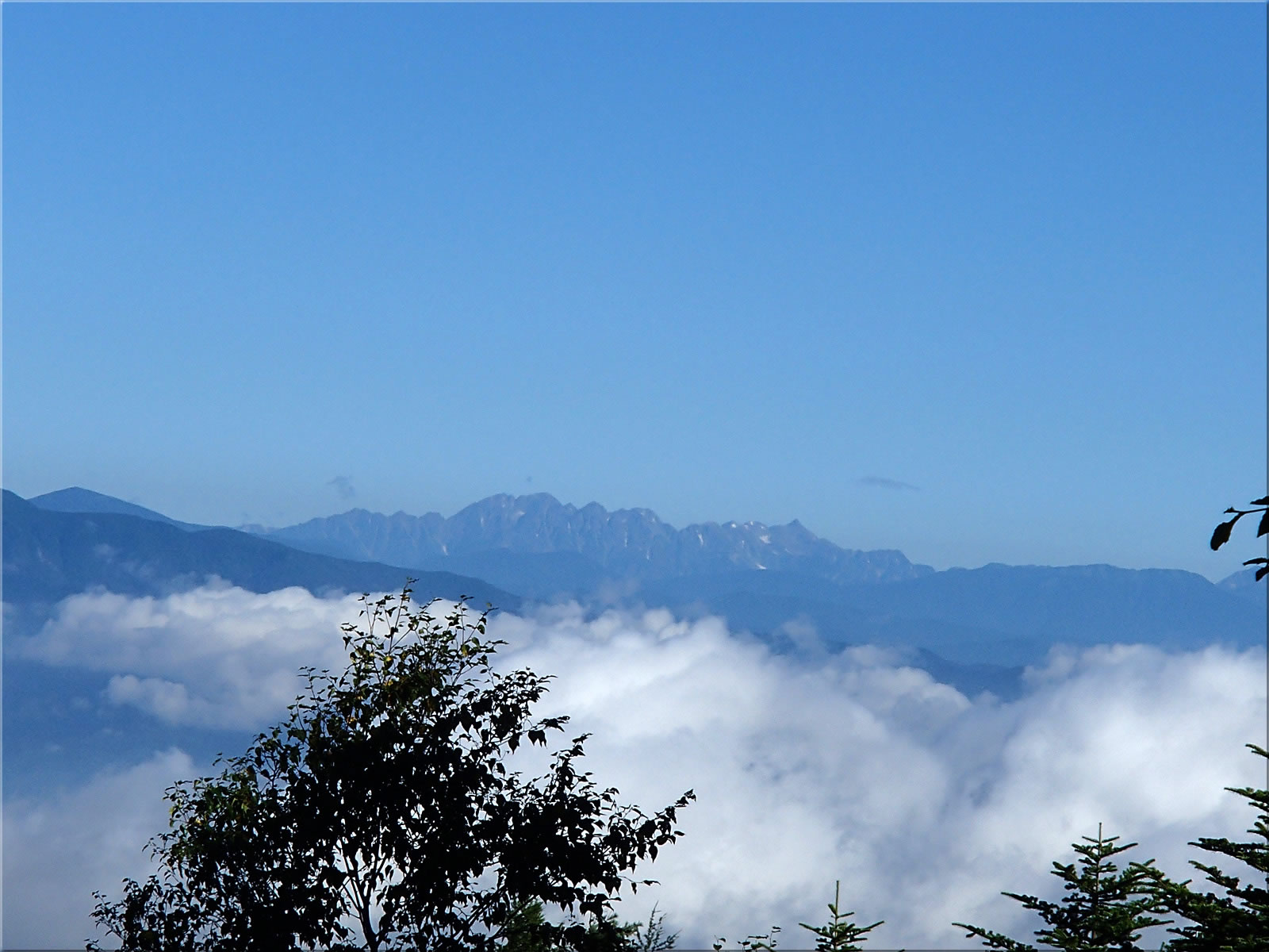 次の写真は東峰山頂からもう少し下ったところにある眺めの良い場所で撮影したものです。この時間になるとやっと仙丈ヶ岳など山の様子が分かるようになりました。