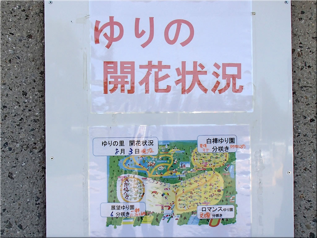 ゆりの開花状況ですが、入ってすぐのロマンスゆり園は見頃、下ったところにある白樺ゆり園は見頃過ぎ散り始め、一番上の展望ゆり園は6分咲きとなっています。