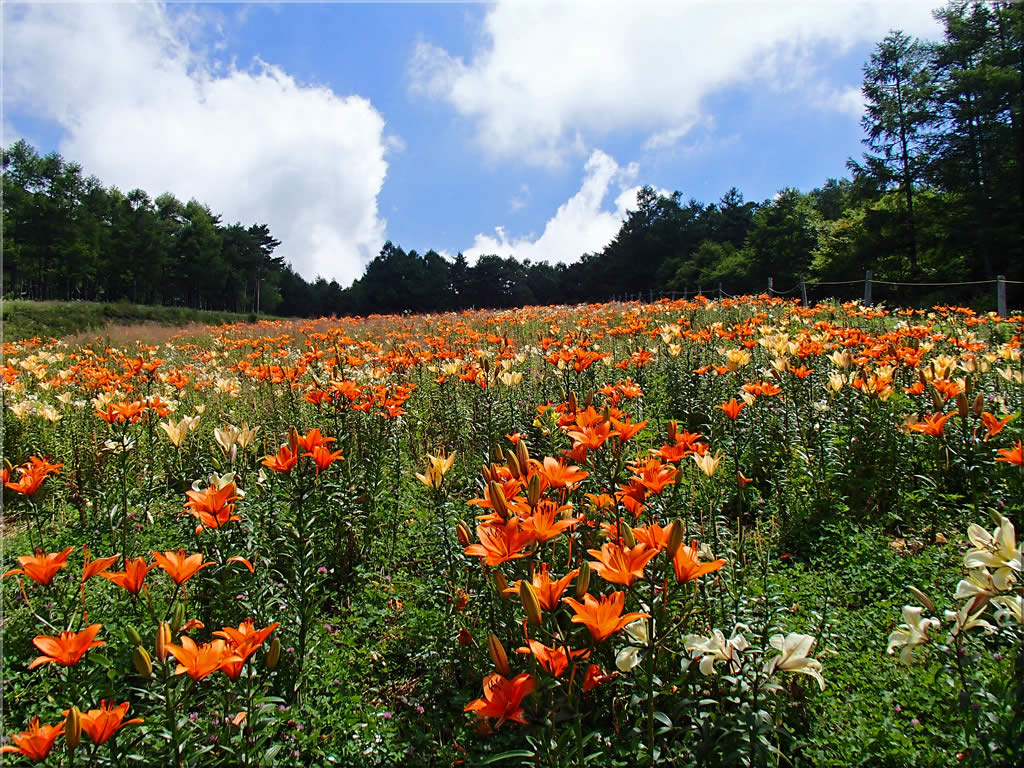 再び甲斐駒をズーム。暑さで山が少しかすんでしまっているのが少し残念ですが、それでもガスで隠れていない分ましということで(^^;。この一面の黄色いゆりは本当に見事です。