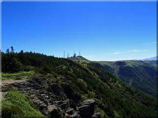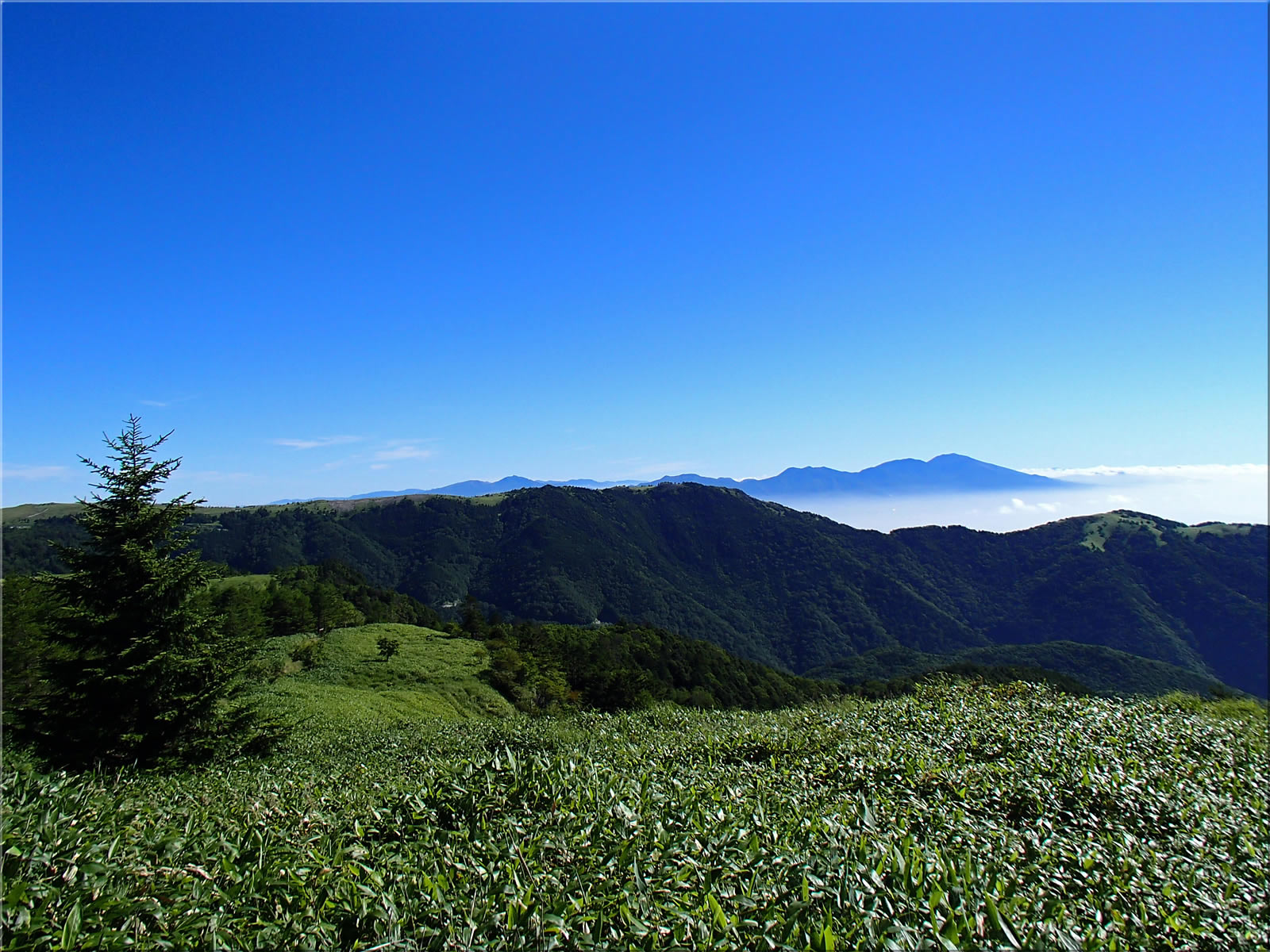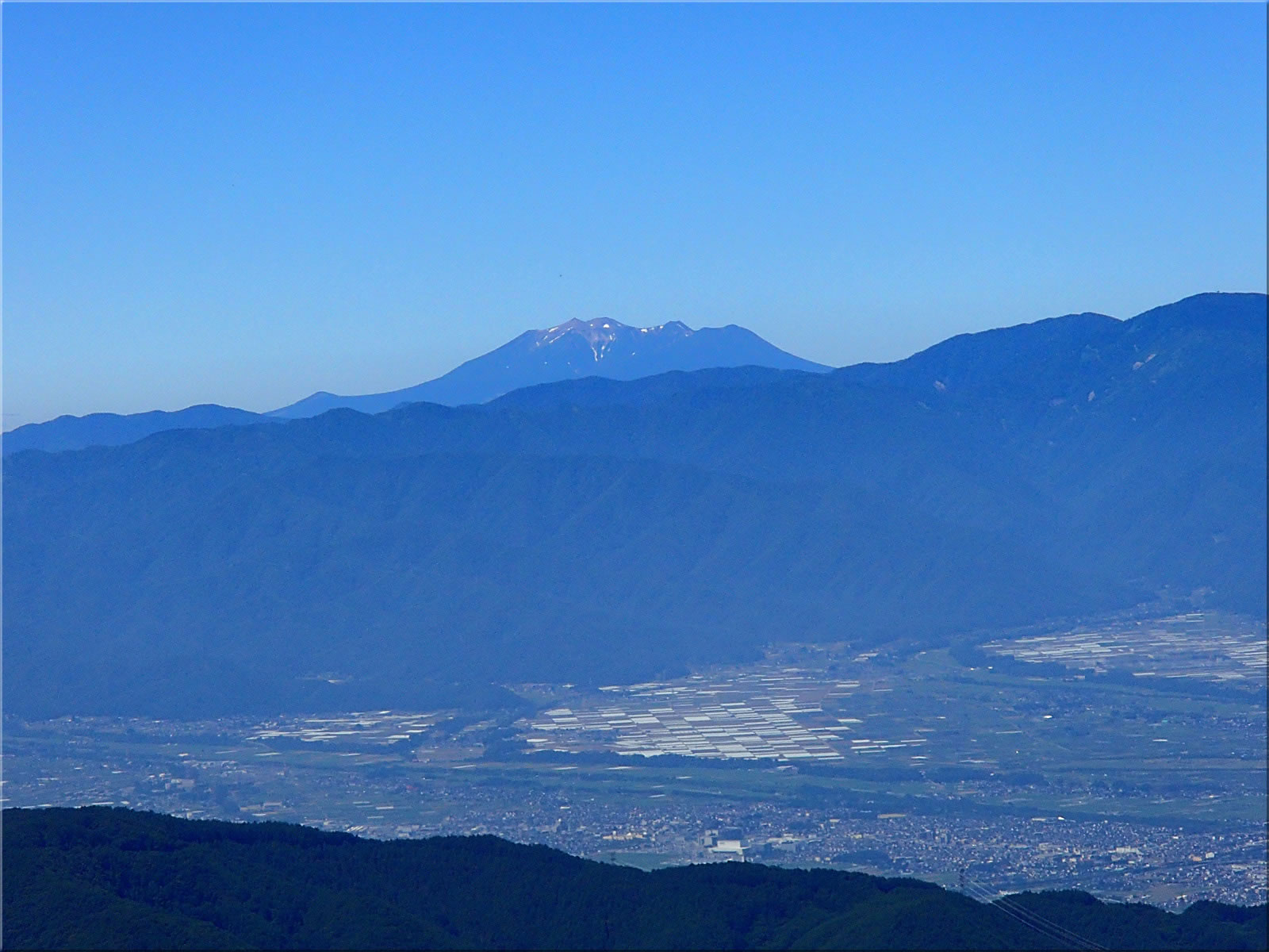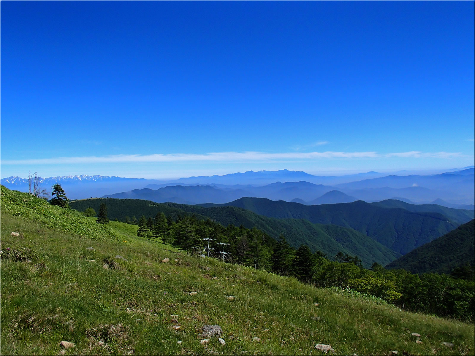 ではここからの展望を北側の茶臼山方面から左回りでご紹介。茶臼山は中央少し右手に見えるピークです。ちなみに左側奥に美ヶ原の王ヶ頭、王ヶ鼻も見えています。当初は茶臼山で引き返す予定でしたが、あまりの快晴に引き返すのがもってなくなり(^^;、まだ一度も訪れたことの無かった王ヶ頭、王ヶ鼻まで足を伸ばしてみることにしたのでした。それにしてもここから見る王ヶ頭、王ヶ鼻ははるか彼方に見えますが、実際にも遠かったです(^^;。