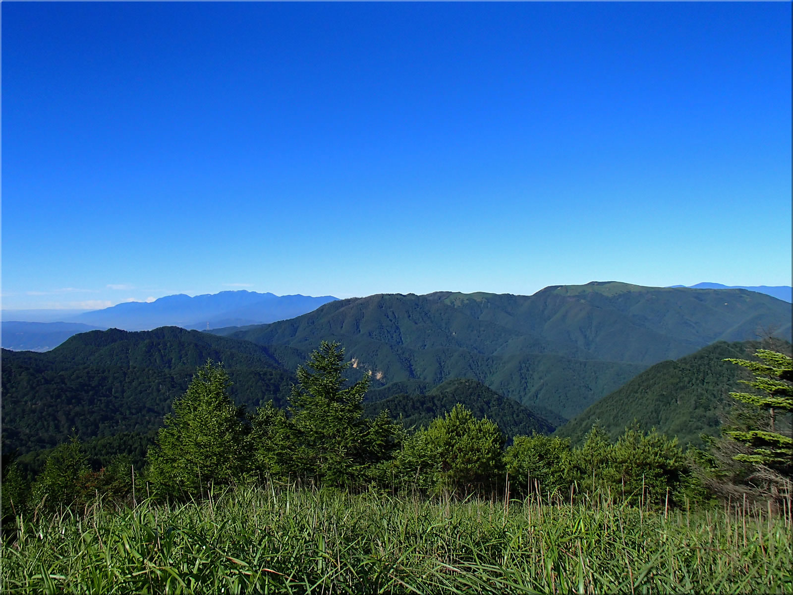 写真だけ撮ったら茶臼山に向けて歩き始めます。この先はしばらく尾根上のアップダウンが続きます。ほぼ無風で日射しが強いのでとにかく蒸し暑いです。