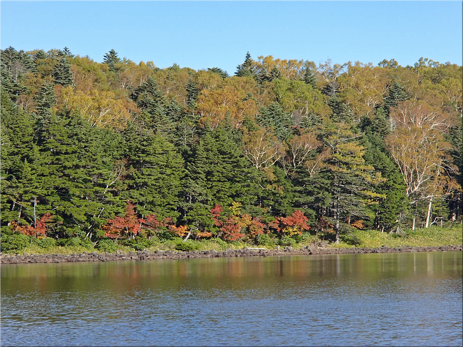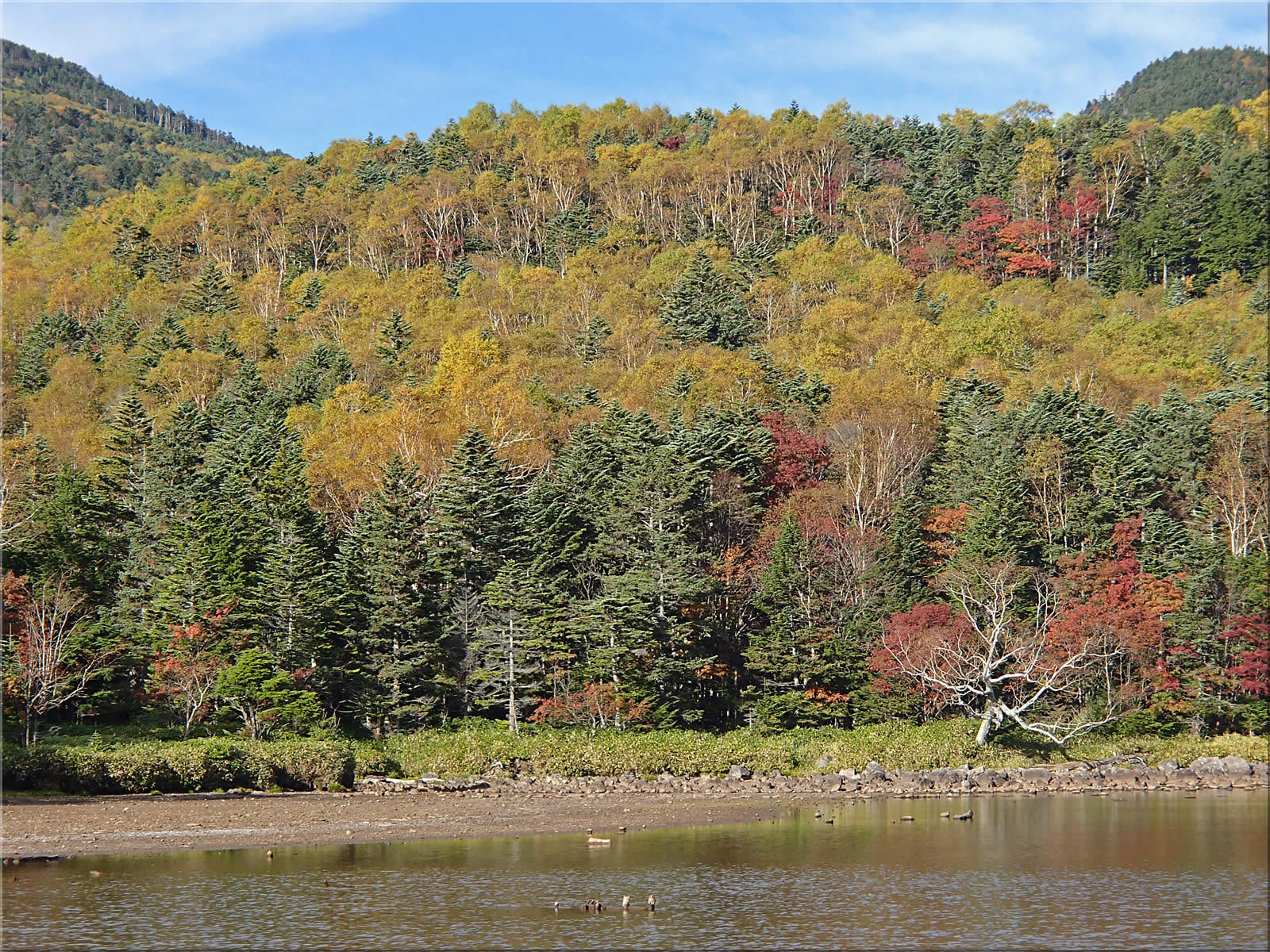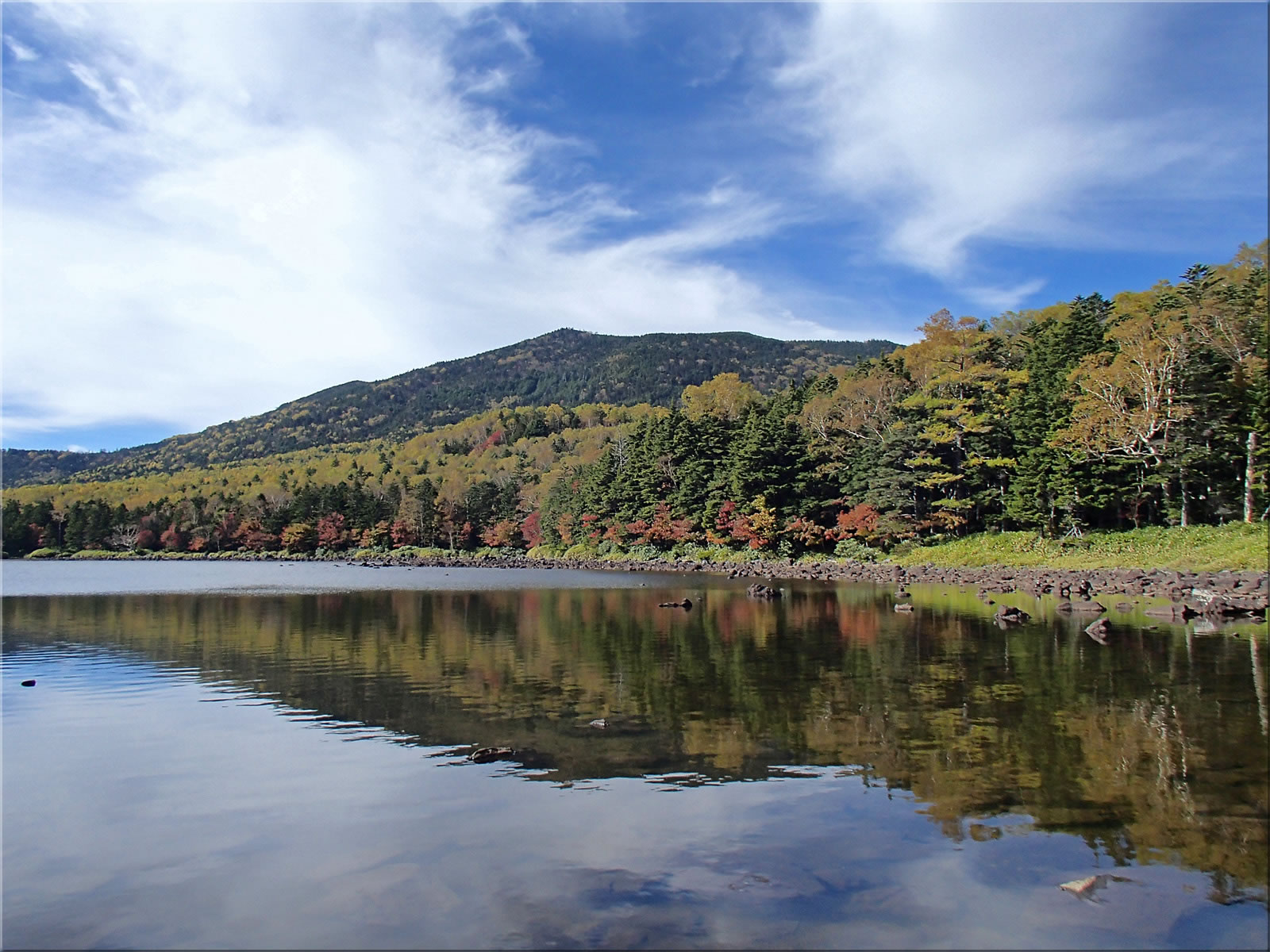 紅葉の時期に雨池は初めて来ましたが、湖畔に赤い紅葉が点在して良い感じです。またその周囲の黄色い黄葉も斜面一面という感じで、こちらも良い感じです。雨池の紅葉、なかなかいいんではないでしょうか(^^)。