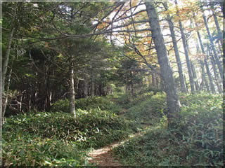 林道から麦草峠に向かう登山道は、朝来た時はまだ日射しが届かずに紅葉もぱっとしなかったのですが、この時間になるといっぱいの日射しを浴びて本当にきれいに輝いています。