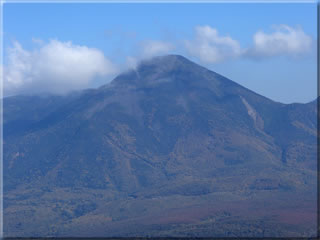 蓼科山をズーム。いつの間にかガスが湧いてきてしまいました。紅葉も蓼科山の麓まで降りてきています。