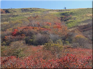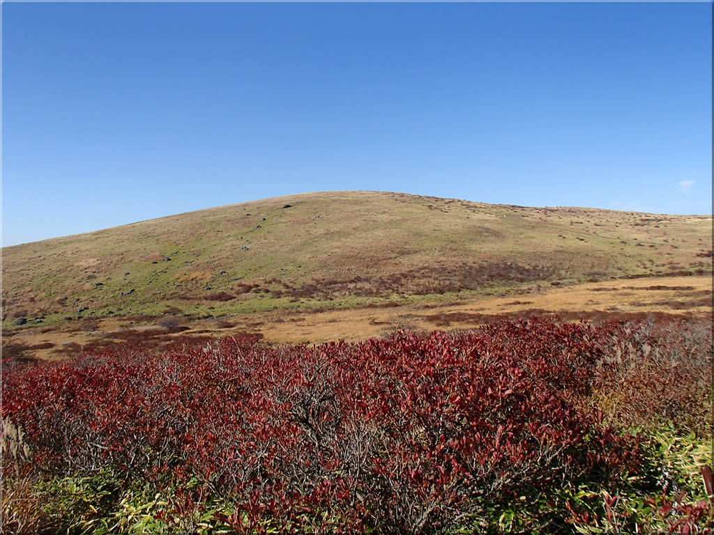 この辺りから車山側の斜面にレンゲツツジが多くなり、一面に広がるそのオレンジ色の紅葉はとてもきれいでした。ちなみに逆光気味で見ると日射しできれいなオレンジ色になりますが、順光だとくすんだ濃い茶色に見えます。レンゲツツジの紅葉を楽しむには日射しは必須です。