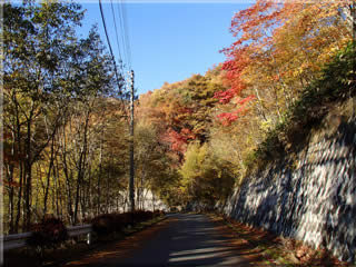 カラマツの林を抜けると次は広葉樹林が続きます。こちら側はもみじが多く、赤い紅葉が目立ちます。ただし日射しがだいぶ傾き、あまり良い写真が撮れません(^^;。