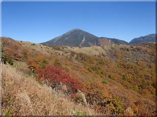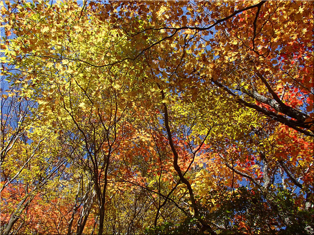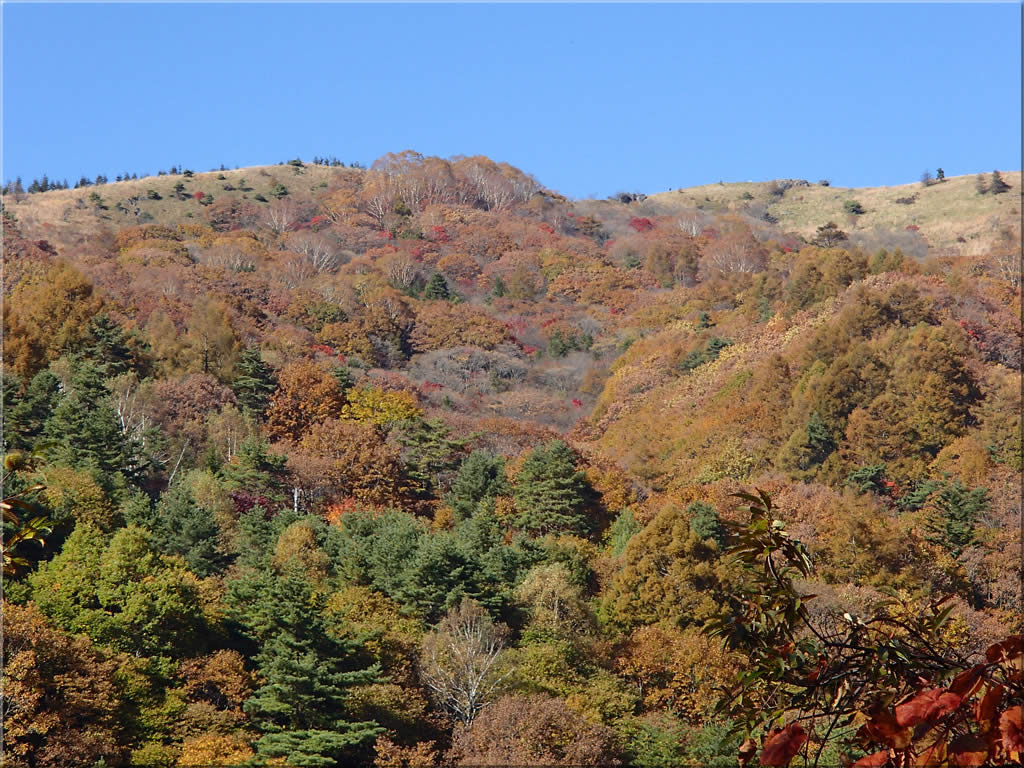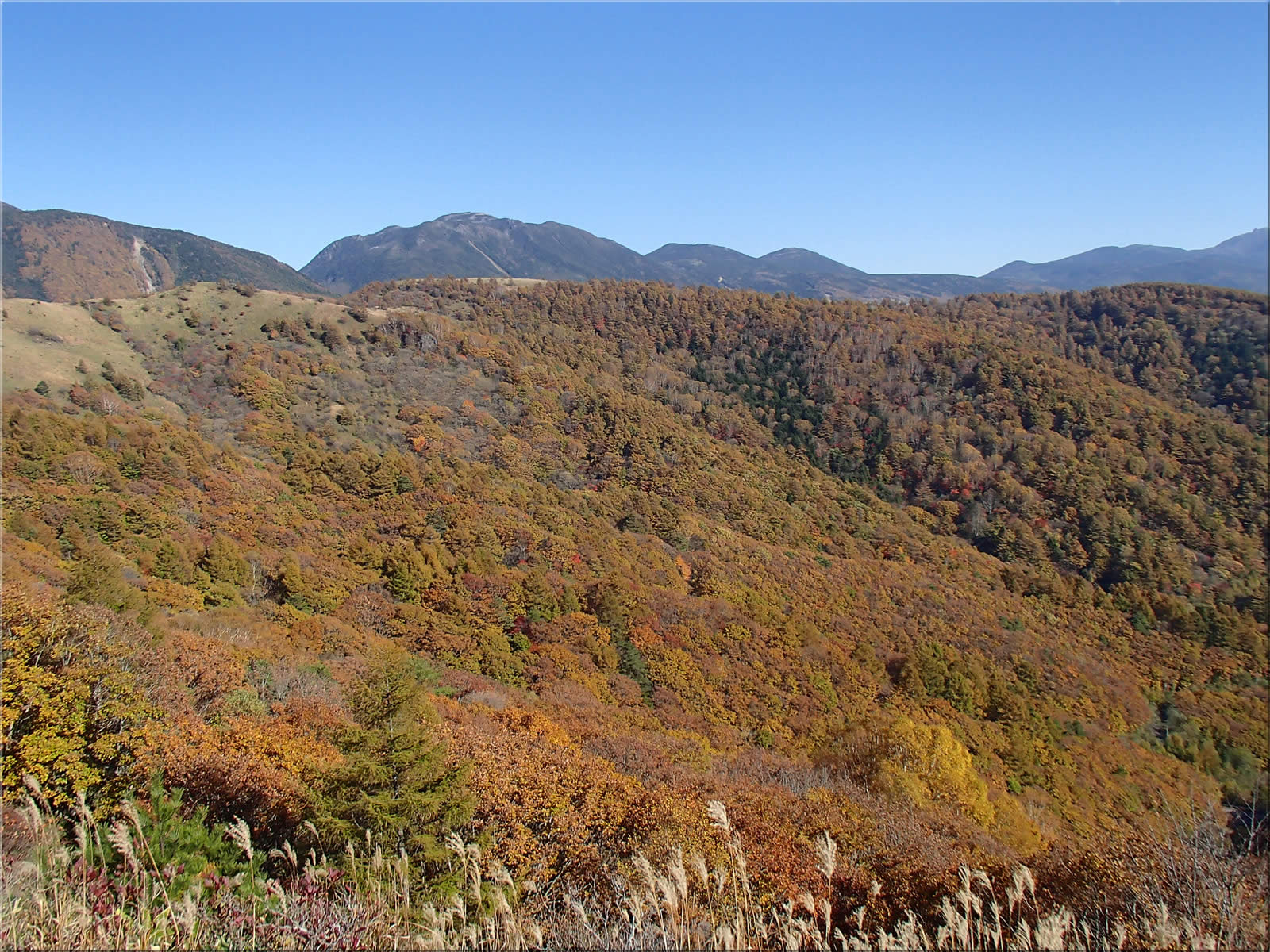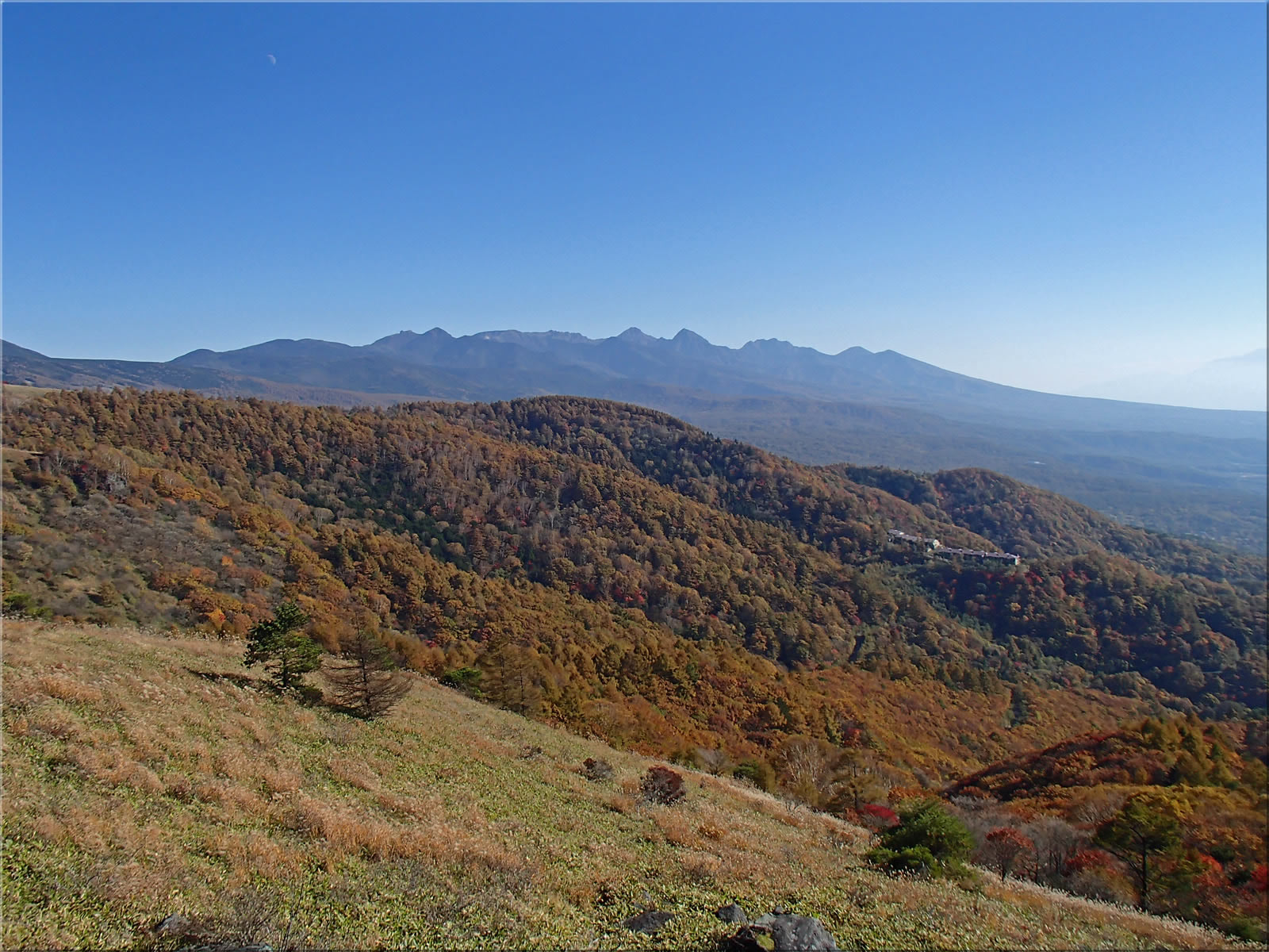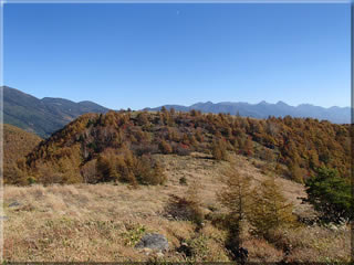ただ出発したのが午後ということで、山にガスがわかないか、また日射しの向きで紅葉がきれいに見えるのか心配でしたが、この日は遠くは少しかすみながらも雲一つ無い快晴が夕方まで続き、また西側登山口から登れば午後でもほぼ順光となり、蓼科山、八ヶ岳を眺めながらの素晴らしい稜線散歩を楽しむことが出来ました。